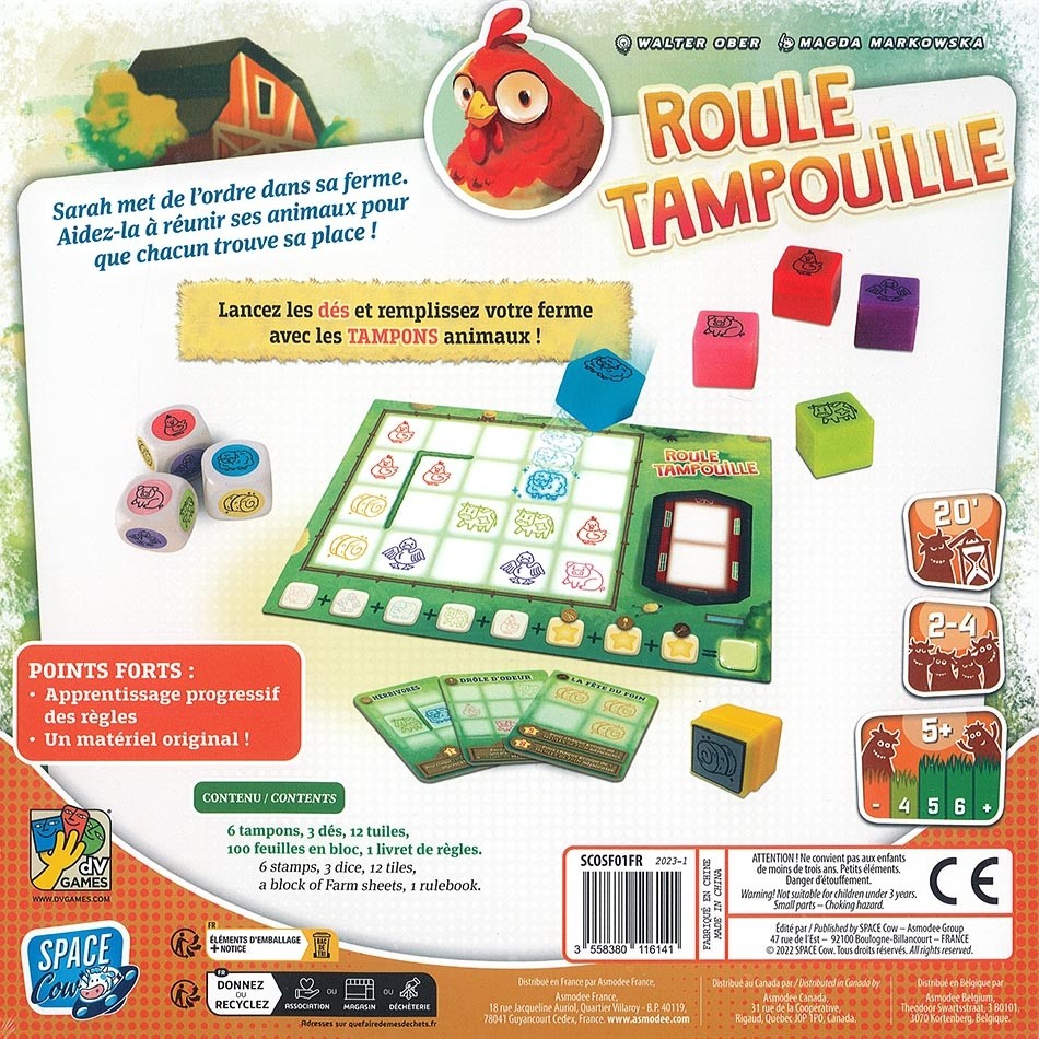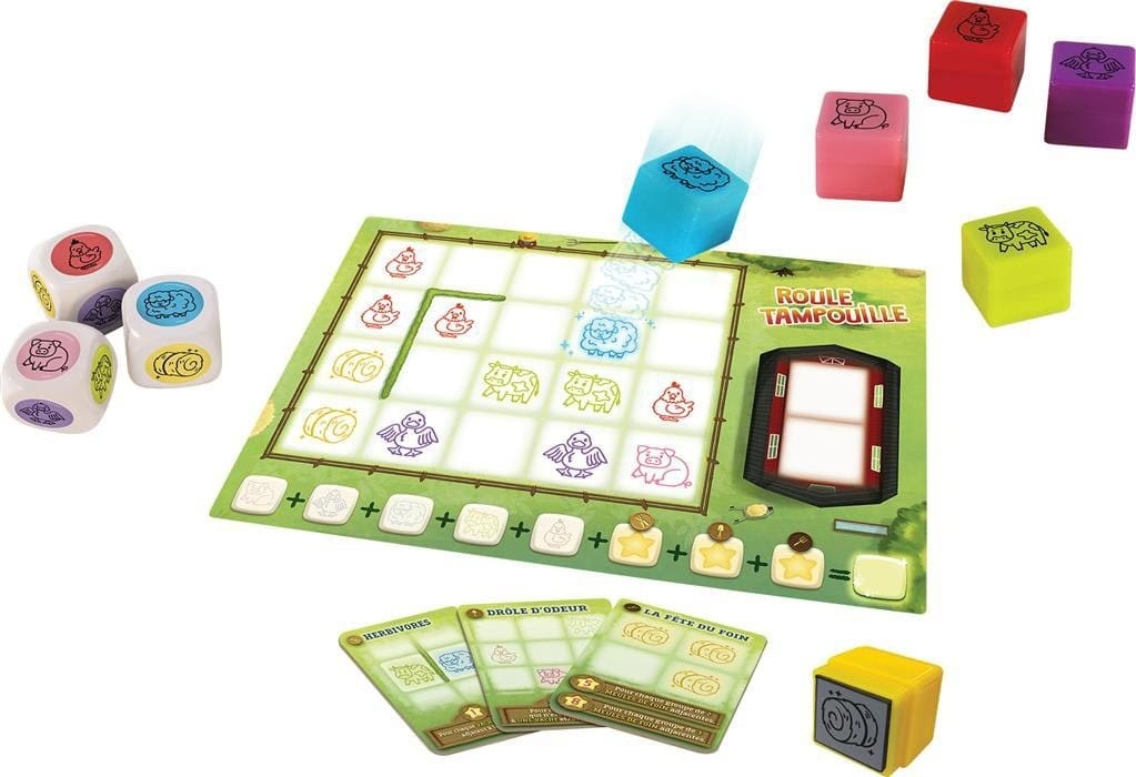 Dans Roule Tampouille, les joueurs sont invités à mettre de l’ordre dans la ferme en rassemblant les animaux dispersés. Poule, vache, cochon, mouton… lancez les dés et utilisez les tampons animaux correspondants pour former le plus grand groupe d’animaux possible sur votre feuille de ferme.