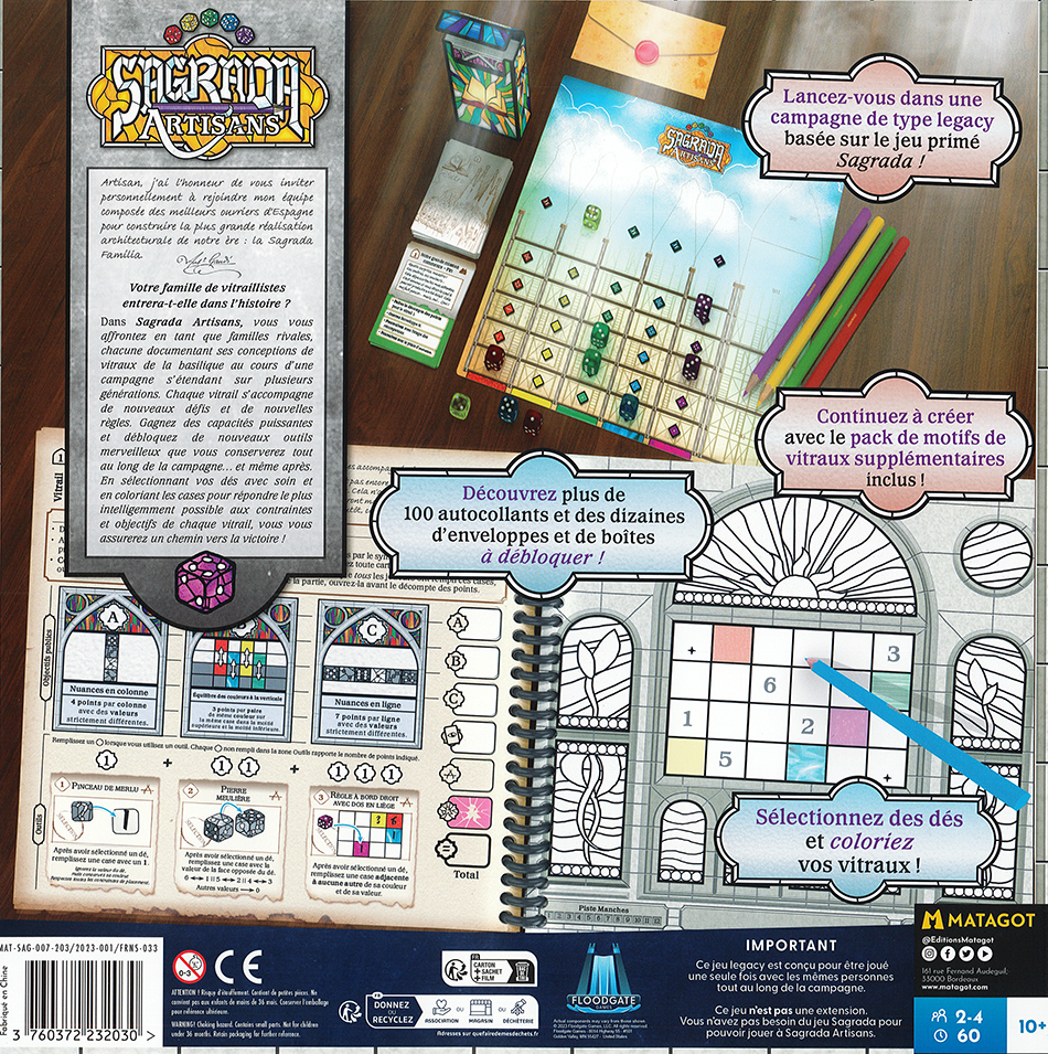 Affrontez d’autres Familles dans une Quête d’Excellence Chaque partie de Sagrada Artisans vous met au défi de rivaliser avec d’autres familles d’artisans, chaque vitrail constituant un nouveau défi à relever. À travers 10 scénarios uniques, vous devrez sélectionner vos dés avec soin et colorier les cases de manière stratégique pour répondre aux contraintes et objectifs spécifiques de chaque vitrail.