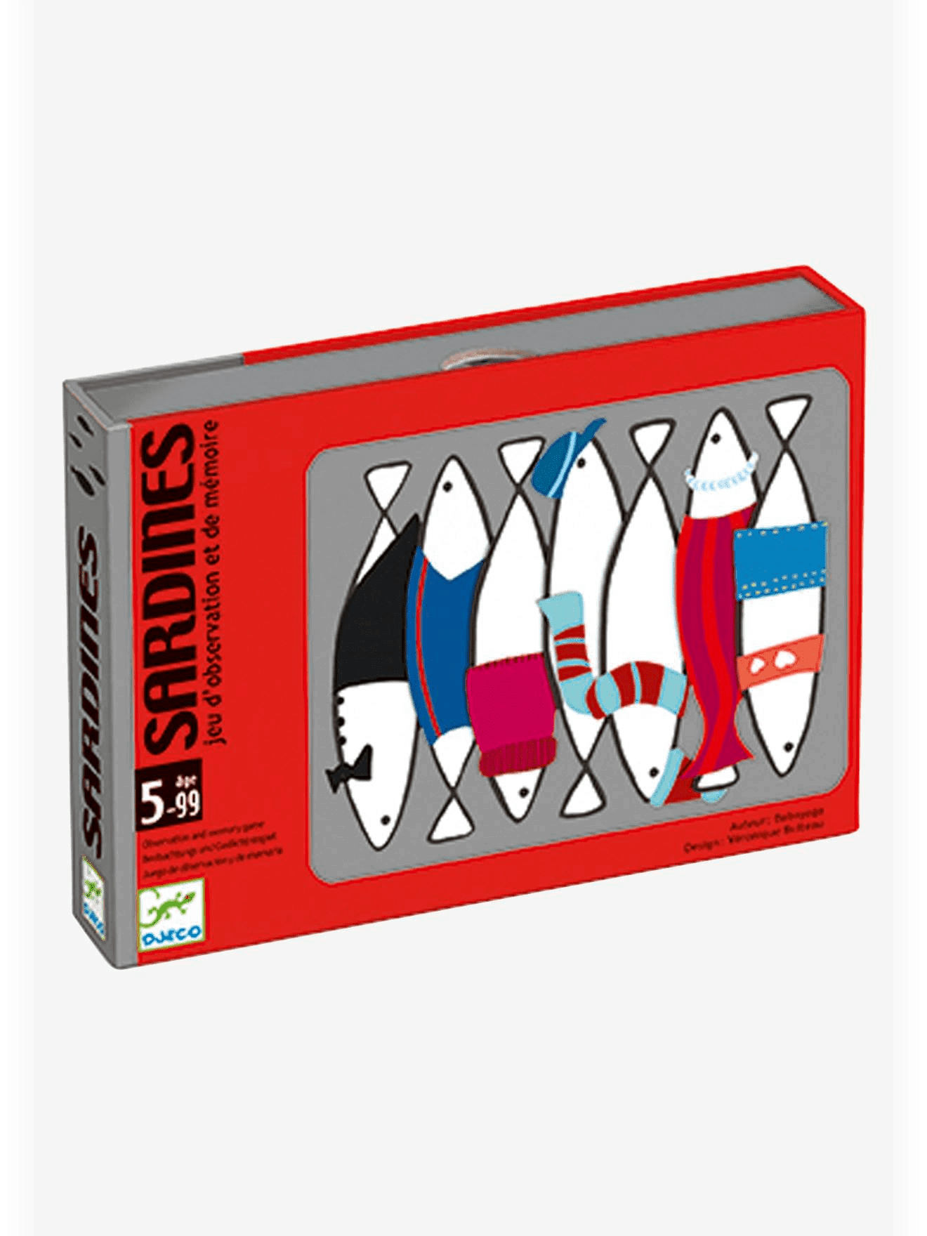 Découvrez Sardines de Djeco, un jeu d’observation et de mémoire visuelle, un jeu de cartes pour les enfants dès 5 ans. Un jeu de mémoire dans lequel il faut retrouver un maximum de sardines parmi celles cachées au fond de la boîte. A chaque tour de jeu, les joueurs ont quelques secondes pour observer et mémoriser les sardines de la boîte puis tenter de les retrouver dans leur jeu. Lorsque la pioche est épuisée, le joueur qui a pêché le plus de sardines remporte la partie! Un très bon jeu pour travailler sa mémoire visuelle avec de drôles de sardines costumées. Des cartes colorées et amusantes présentées dans une boîte de jeu compacte, un jeu de voyage à emporter partout.