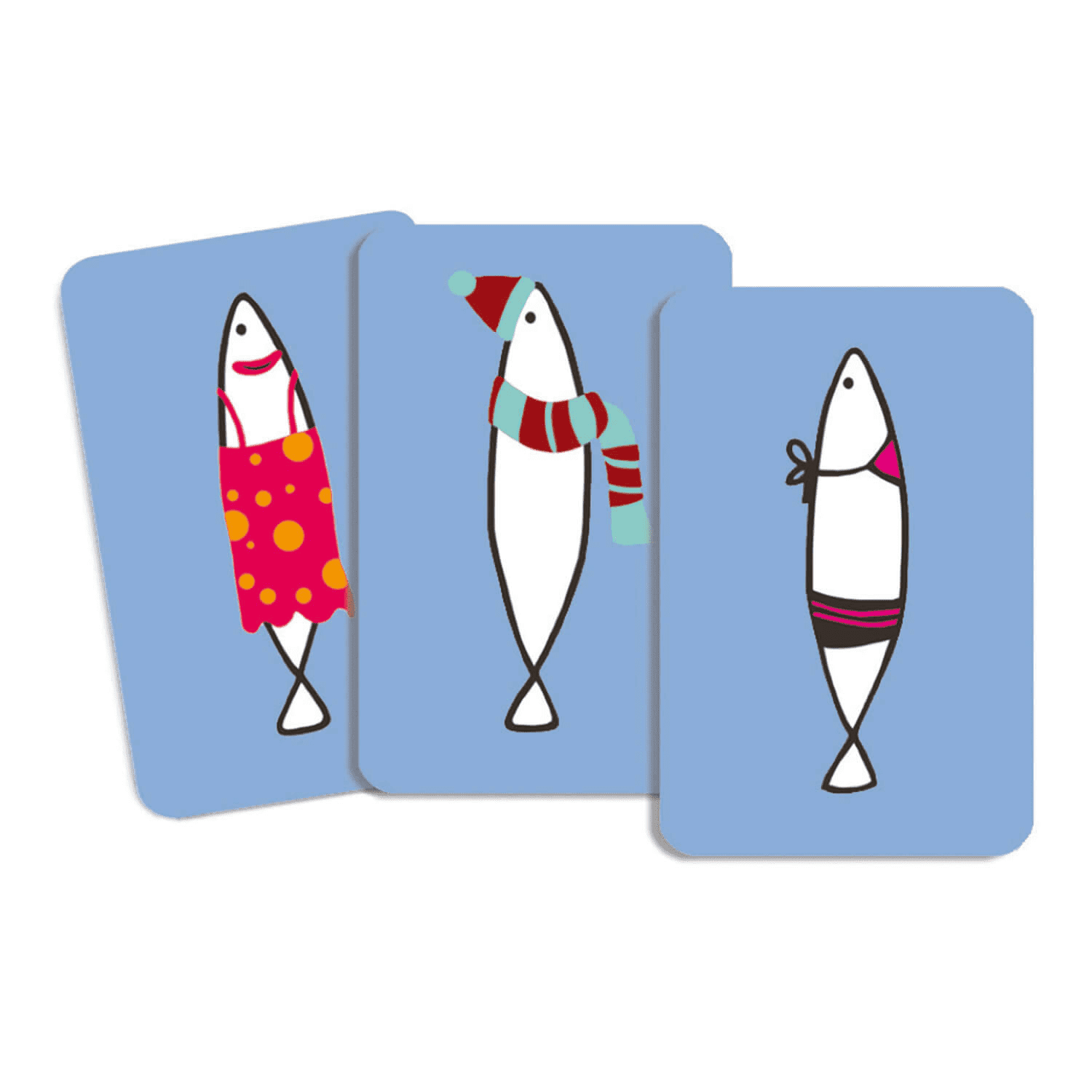Un jeu comprenant 50 cartes (40 petites cartes « Sardine » et 10 grandes cartes « Boîte à Sardines ») et la règle du jeu en 10 langues.