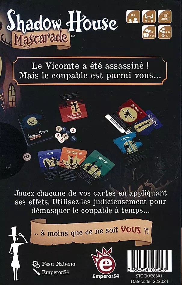 Le Vicomte Shadow a été assassiné… et le coupable est parmi vous. Dans Shadow House Mascarade, l’élégance d’un dîner mondain vire au cauchemar lorsqu’un cri déchire la soirée : le vicomte a été retrouvé mort ! Le majordome verrouille les issues : personne ne sort tant que le coupable n’est pas identifié.