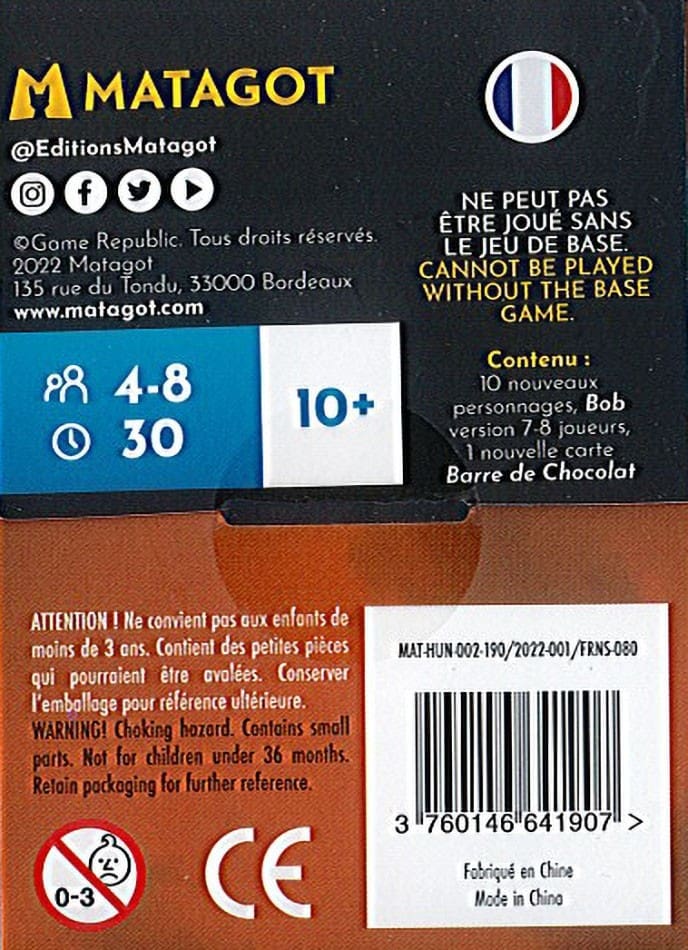 Pour les parties de 7 à 8 joueurs, l’extension propose une version spéciale de Bob, offrant une expérience adaptée aux grandes tables. Avec ses capacités uniques, Bob ajoute une dimension supplémentaire à vos parties, favorisant les interactions entre un plus grand nombre de joueurs.