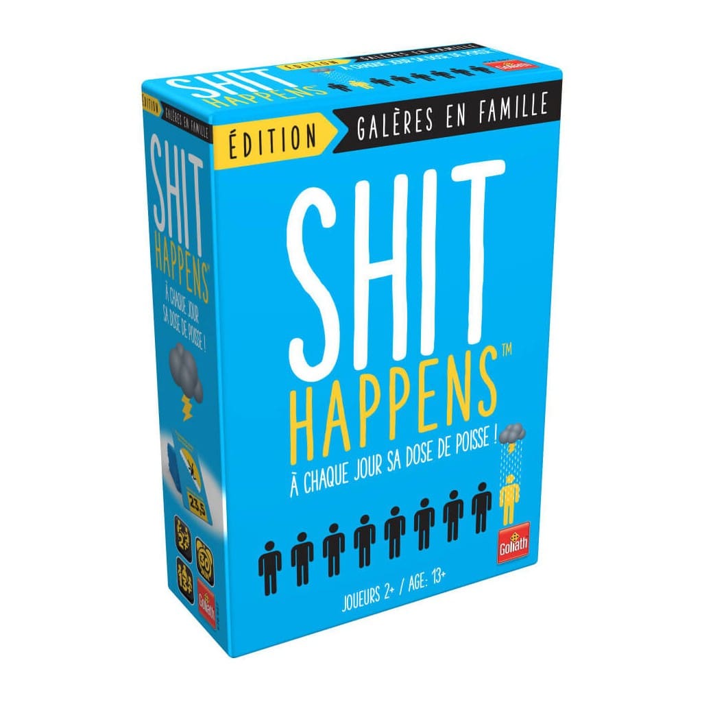 Shit Happens: Galère en Famille vous entraîne dans un tourbillon de situations hilarantes et infernales. Piochez des cartes décrivant des scénarios absurdes et souvent déconcertants, des accidents de la vie quotidienne aux situations improbables, et classez-les sur l’échelle du Shit-O-Mètre en fonction de leur degré de galère.
