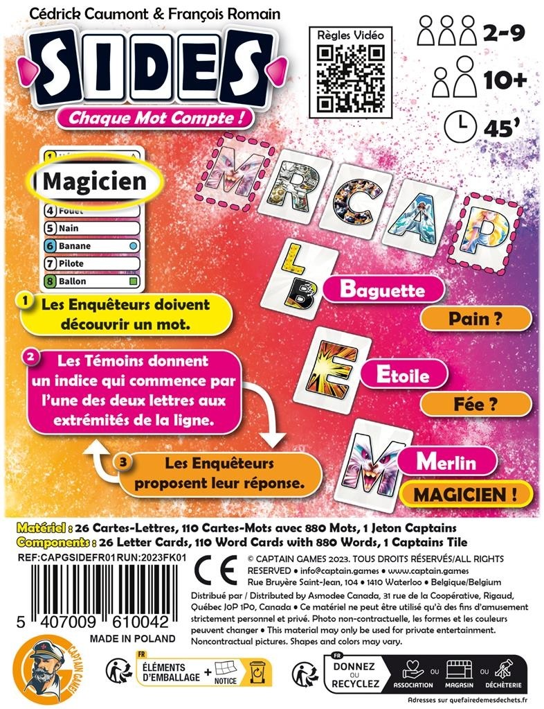 Sides se distingue par la richesse de la langue et la variété infinie de mots possibles. Les joueurs cherchent sans cesse le mot parfait pour répondre aux contraintes des cartes-lettres.