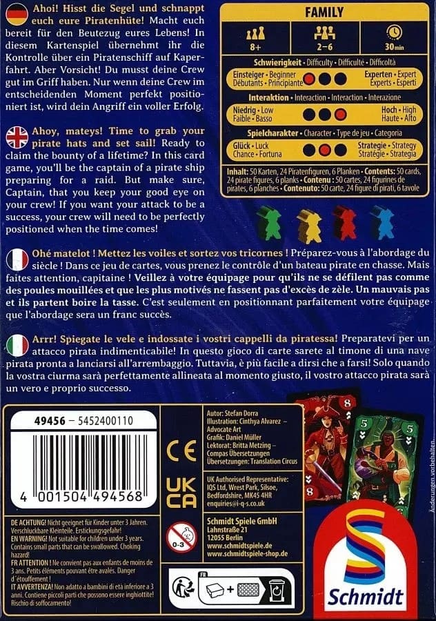 Un placement stratégique : À chaque tour, jouez vos cartes pour déplacer vos pirates sur la planche. Attention aux excès de zèle : Si un pirate dépasse les cases, il tombe à l’eau et ne rapporte aucun point ! Un savant mélange de stratégie et de prise de risque Au fil des tours, vos décisions détermineront votre succès :