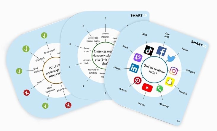 SMART 10 FAMILLE, le quiz nomade où tout est inclus dans le boîtier. En mode solo ou par équipe, parents et enfants se défient et se complètent pour remporter la victoire !