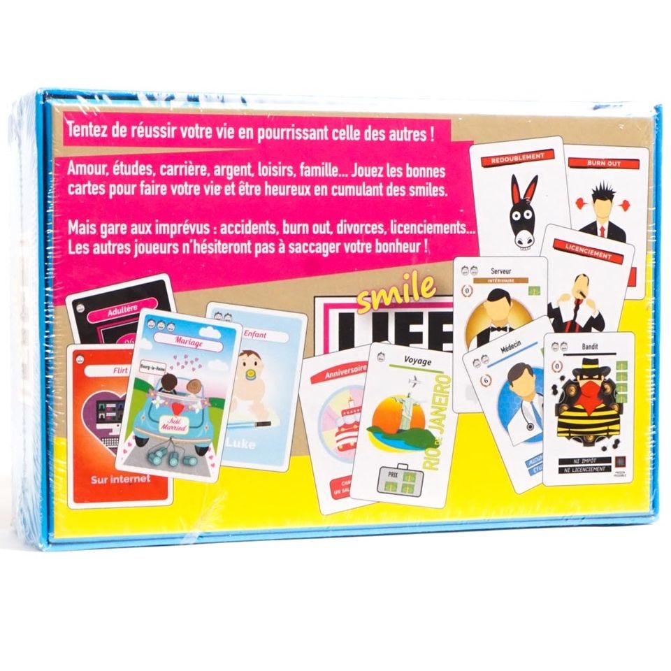Amour, carrière, études, loisirs, argent, famille… Jouez les bonnes cartes pour cumuler des smiles et être le plus heureux. Mais gare aux imprévus : accidents, divorces, impôts, prison, maladies… Les autres joueurs n’hésiteront pas à saccager votre bonheur ! Smile Life consiste à faire et réussir sa vie. Les cartes représentent pour cela des événements liés aux domaines professionnel et personnel : amour, argent, famille, études, carrière, etc. Chaque joueur tâchera d’obtenir les meilleures cartes pour bâtir sa situation et être le plus heureux possible. Sans épargner les autres pour autant…