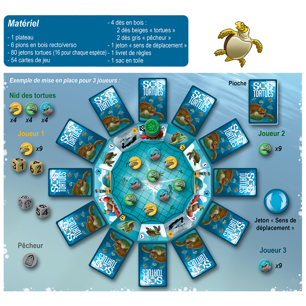 Contrôler une espèce de tortue et échapper au pêcheur ! À son tour, il faut nager ou rester sur place. Nagez pour fuir le pêcheur en lançant les dés pour se déplacer, réalisez l’action du plateau de jeu et enfin, révélez une carte et en appliquez son effet. Restez sur place et risquez de se faire rattraper par le pêcheur et piocher 2 cartes, une pour soi et une pour un autre joueur ! Le pêcheur joue en dernier, il se déplace pour essayer de capturer des tortues. Il est joué à tour de rôle par les « Tortues » ou incarné par un joueur. Dans tous les cas, si un joueur n’a plus de tortue, il retourne son pion et devient pêcheur à son tour ! La partie prend fin lorsque la pioche est terminée. Le joueur à qui il reste le plus de tortues gagne ! S’il n’en reste aucune, c’est le pêcheur qui gagne !