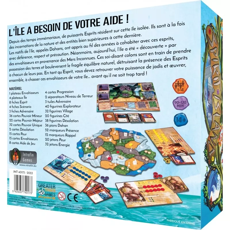 Dans le jeu Spirit Island, chaque joueur incarne un Esprit de la nature, défendant son île contre des Envahisseurs qui n’ont aucun égard pour le bien être de cette terre ou de ses habitants, les Dahans.À chaque tour, tous les Esprits jouent simultanément, utilisant leurs Pouvoirs pour repousser les Envahisseurs, défendre l’île, et venir en aide aux Dahans.