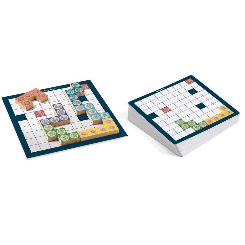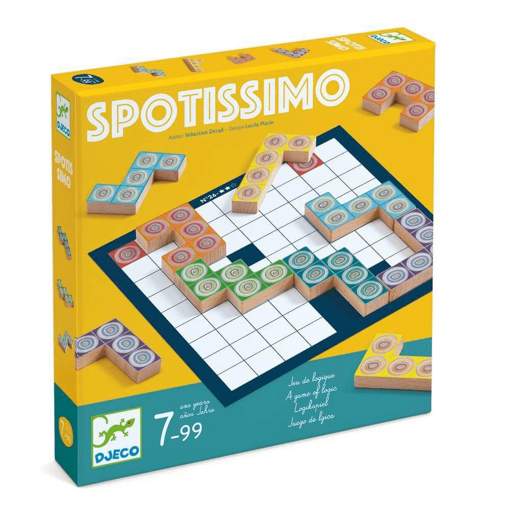 Découvrez Spotissimo de Djeco, un jeu de logique dans lequel il faut réussir à relier les 2 cases rouges indiquées sur la carte en combinant les 6 pièces en bois, un jeu de casse-tête pour les enfants à partir de 7 ans. 3 niveaux de difficulté pour progresser à son rythme. Au total, 40 défis sont à relever avec des positions de départ imposées et des obstacles à ne pas franchir. À vos méninges! Le joueur tire une carte « défi » qui lui indique les deux cases rouges à relier ainsi que la position de certaines pièces en bois (pentaminos). Il tente alors de placer tous les autres pentaminos afin de relier les deux cases rouges en respectant les contraintes : le chemin créé doit être continu, les pièces ne doivent se toucher que par un coté, les cases de couleur bleu foncé sont des obstacles sur lesquels on ne peut pas poser de pentaminos. Au total, ce sont 40 défis à relever!