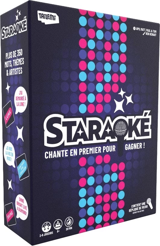 Facile à expliquer et rapide à jouer, Staraoké est un jeu d’ambiance convivial qui s’adapte aussi bien aux petits groupes qu’aux grandes tablées.