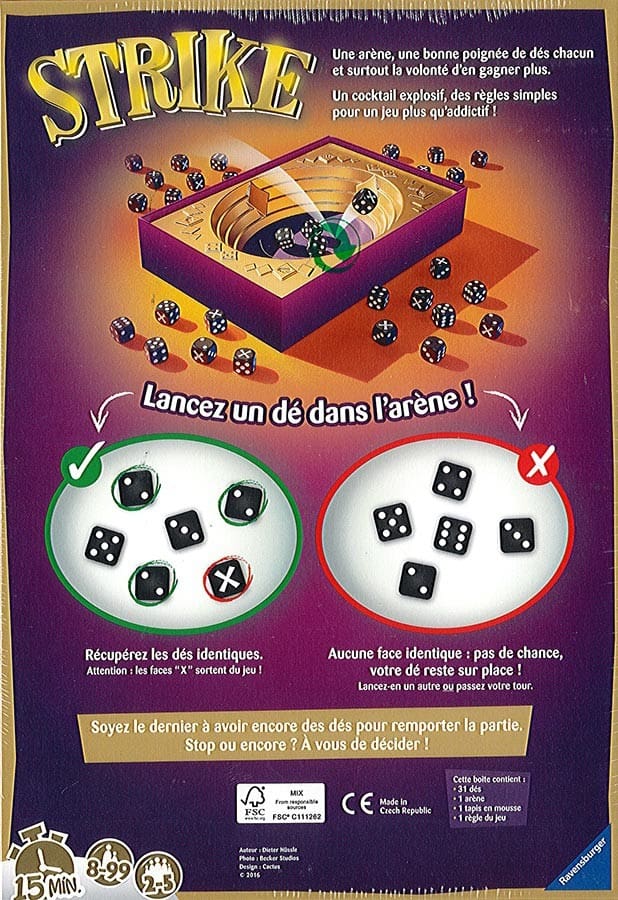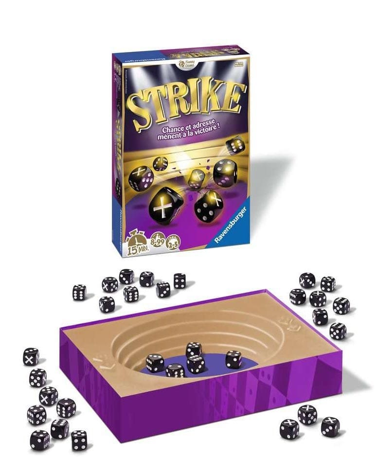 Strike mêle chance et prise de risque. Vous devez décider quand vous arrêter pour sécuriser vos dés tout en surveillant vos adversaires. Parfois, il vaut mieux s’arrêter tôt pour éviter de tout perdre.