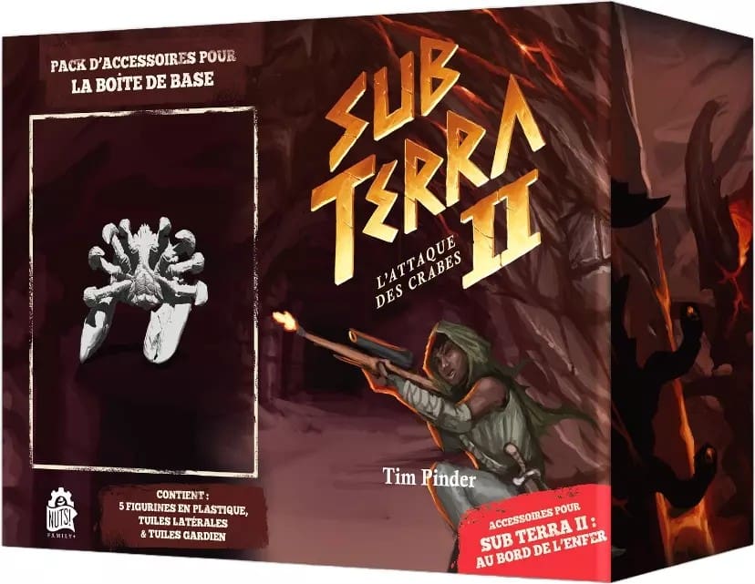 Ce pack d’accessoires contient 6 tuiles alternatives (tuiles Latérales et Gardien alternatives) et 5 figurines détaillées de Crabes de lave utilisables en tant que versions améliorées des Gardiens de la boîte de base. Avec l’Attaque des Crabes, mettez le feu dans vos parties de Sub Terra II : Au bord de l’enfer !