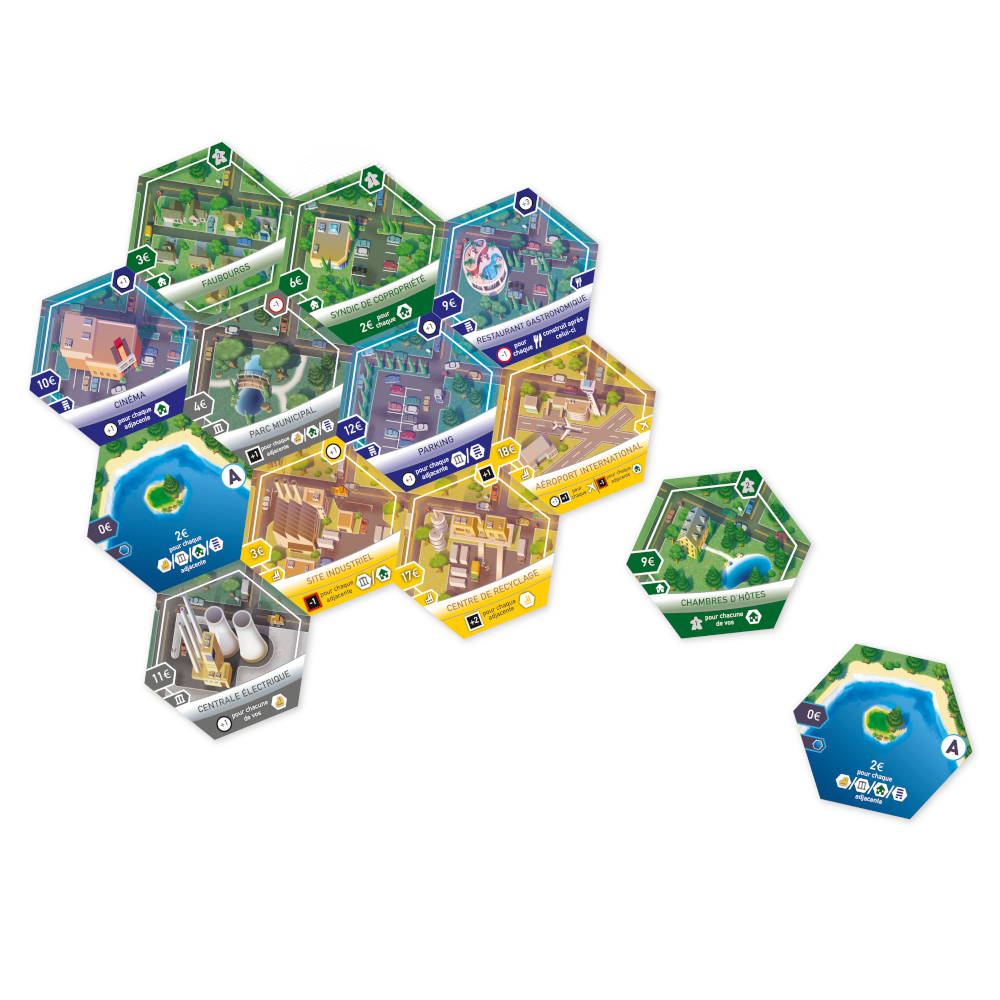 Planifiez, construisez et développez votre petite ville en une grande métropole ! Utilisez des tuiles de construction hexagonales pour ajouter des zones résidentielles, commerciales, civiques et industrielles, ainsi que des points d’intérêt spéciaux qui offrent des avantages et tirent parti des ressources des villes voisines. Votre objectif est de faire prospérer votre arrondissement et de vous retrouver avec une population plus importante que n’importe lequel de vos adversaires.