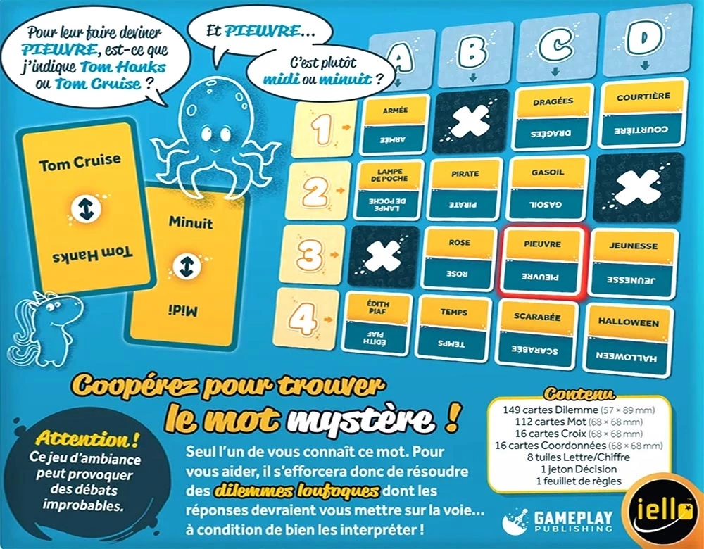 À chaque manche, l’Extralucide choisit un mot caché parmi une grille de 16, puis pioche une carte Dilemme (du type « TikTok ou Instagram ? », « Léger ou Lourd ? ») et indique la réponse qui, selon lui, colle le mieux avec le mot secret. À vous, ensuite, de discuter, débattre et surtout vous mettre d’accord pour éliminer un ou plusieurs mots. Si vous parvenez à conserver le bon mot jusqu’au bout de la 5e manche, vous gagnez ensemble !