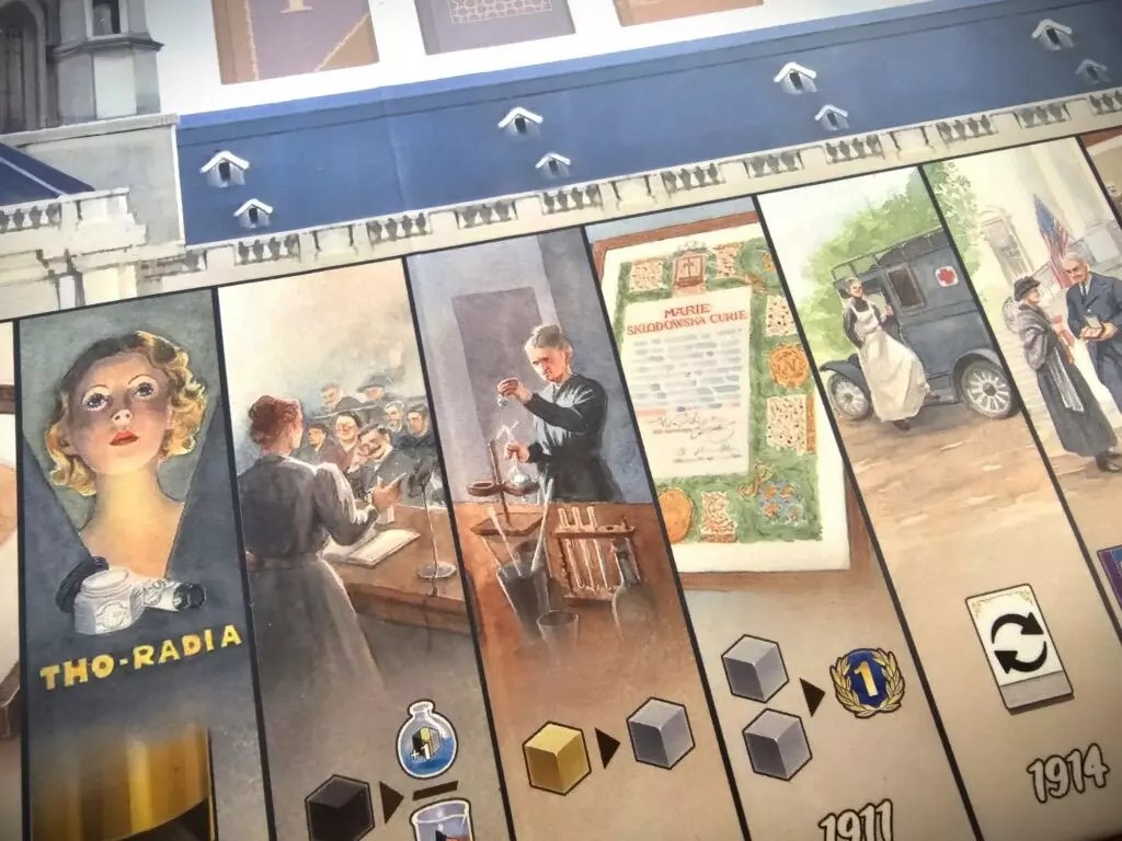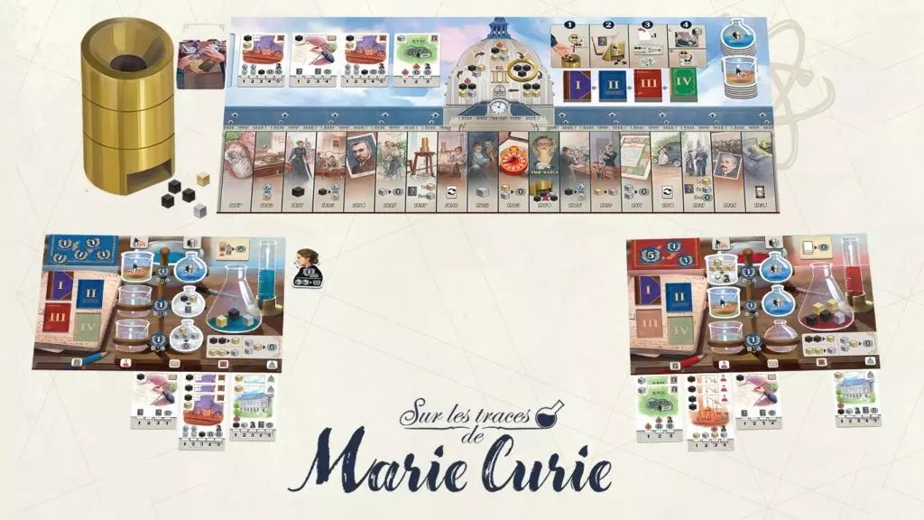 - Un plateau au fil de la vie de Marie Curie Une ligne temporelle immersive : Le plateau principal retrace les grandes étapes de la vie de Marie Curie (1867-1934). À chaque étape, vous progressez dans l’histoire et débloquez de nouvelles possibilités. Laboratoire personnel : Sur votre propre plateau, gérez vos cubes de ressources (Pechblende, Uranium, Radium), vos tuiles Expérience, vos cartes Activité, et vos jetons Thèse.