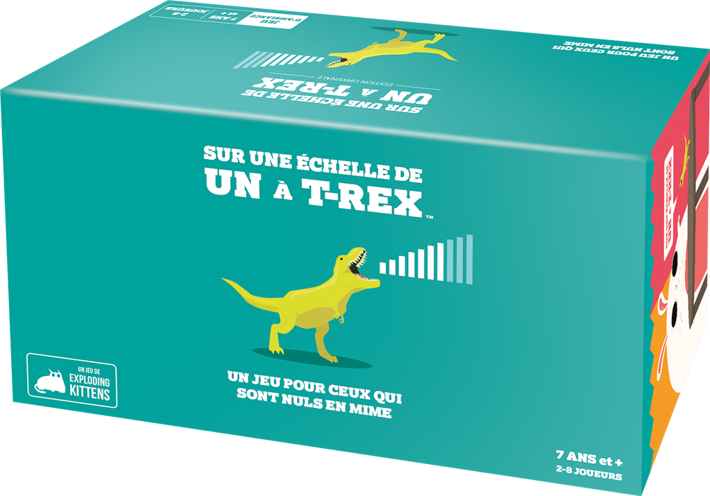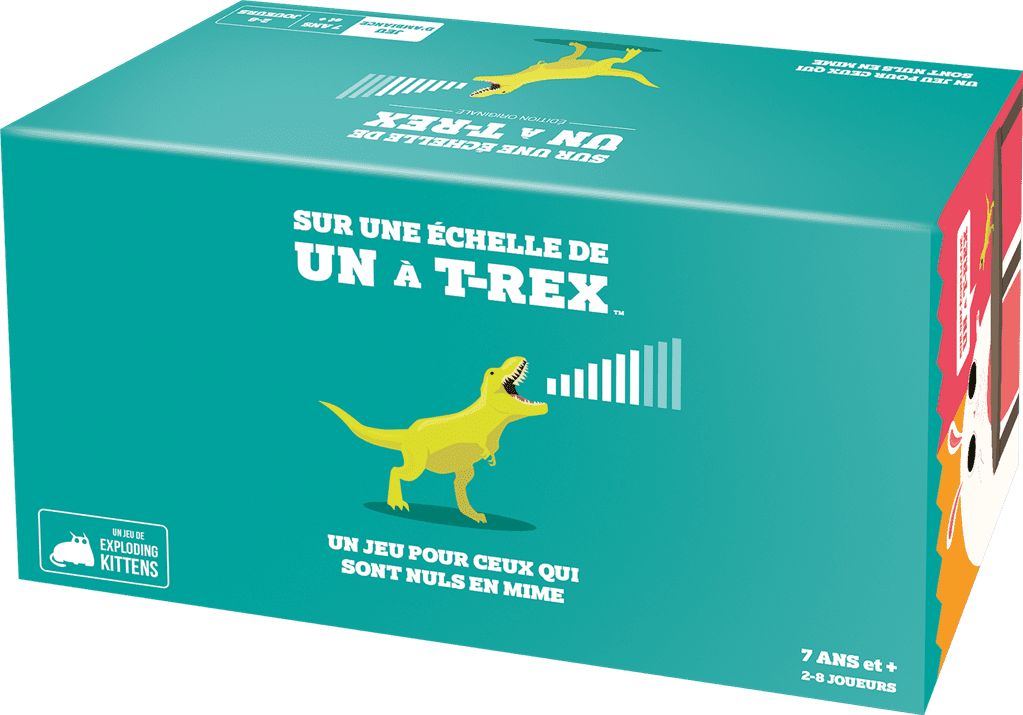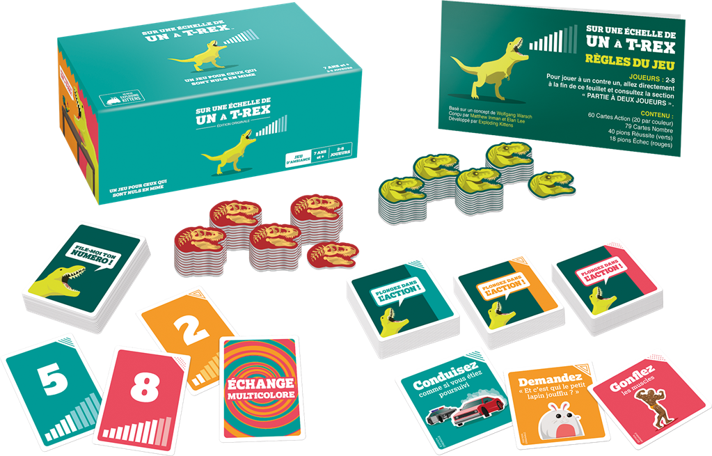 On a Scale of One to T-Rex est un summum du jeu d’ambiance, du party game. L’objectif est simple : s’éclater pour gagner la partie. Tous les participants doivent interpréter ce qu’indique une carte qui leur est propre : imiter un T-Rex, découvrir que vous avez des doigts, faire le chat, etc. Toutes et tous reçoivent une carte d’intensité, privée, qui correspond à la force qu’ils doivent mettre dans leur performance.