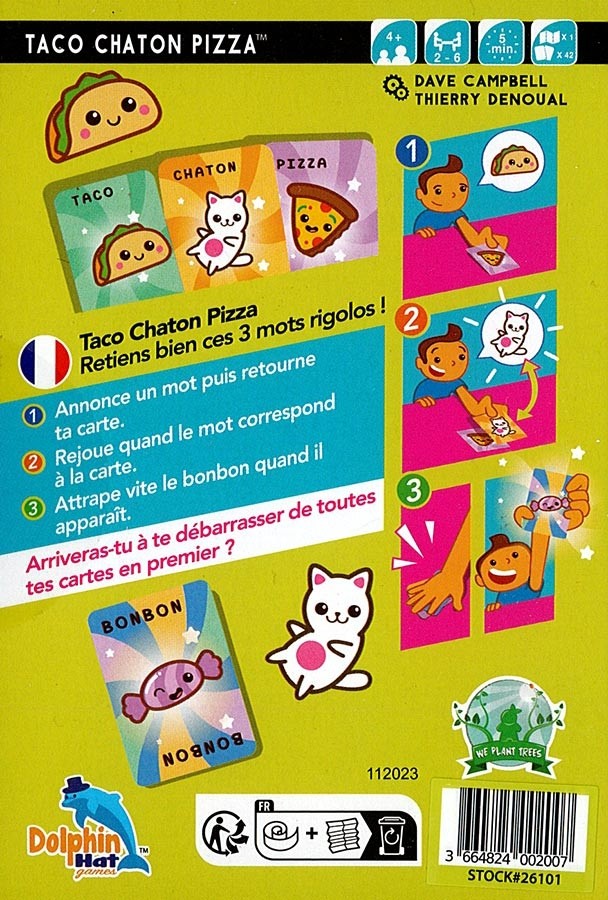 Description du Jeu : Dans Taco Chaton Pizza, les joueurs se battent pour être les premiers à collecter les bonnes combinaisons de cartes pour gagner. Le jeu combine des éléments de collection de cartes avec un thème ludique qui plaira aux amateurs de jeux familiaux.