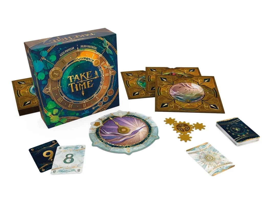 Le jeu se compose de cartes numérotées de 1 à 12 en version jour (fond blanc) et 1 à 12 en version nuit (fond noir). Mais attention : vous savez où les cartes doivent finir, sans savoir ce que les autres ont joué… et sans pouvoir parler ! Le jeu comporte 24 cartes numérotées de 1 à 12 sur fond blanc (jour) et de 1 à 12 sur fond noir (nuit). À chaque manche, les joueurs se répartissent ces cartes et les placent, à tour de rôle, autour d’une horloge divisée en six sections, tout en respectant des contraintes spécifiques. Ces règles impliquent de placer au moins une carte par section, certaines sections exigeant un nombre précis de cartes avec des valeurs minimales ou maximales à atteindre. La plupart des cartes étant jouées face cachée, vous devrez faire preuve d’intuition et de coordination, malgré une communication limitée. Avec 40 horloges aux règles évolutives et à la difficulté grandissante, chaque partie de Take Time est un nouveau défi où stratégie et anticipation seront vos meilleurs alliés. Prêts à embarquer pour un voyage fascinant à travers le temps ? À chaque manche : Les joueurs se répartissent les cartes. Ils les placent autour de l’horloge, section par section. Ils doivent respecter les contraintes imposées (minimum ou maximum de cartes, valeurs spécifiques, etc.). La plupart des cartes étant posées face cachée, il faut s’appuyer sur son intuition, deviner les intentions des autres et anticiper leurs choix pour réussir.