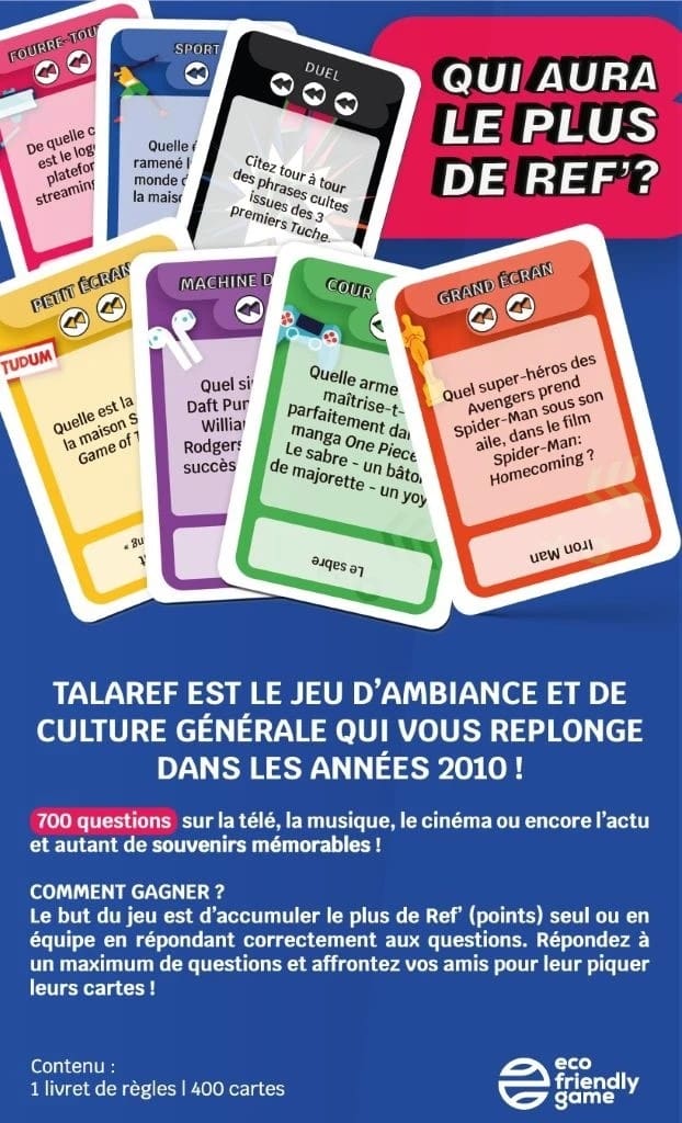 Accessible et plein d’humour, Talaref : Années 2010 promet des soirées animées entre amis ou en famille. Un jeu parfait pour tester vos connaissances, taquiner vos proches et raviver vos meilleurs souvenirs de la décennie passée !