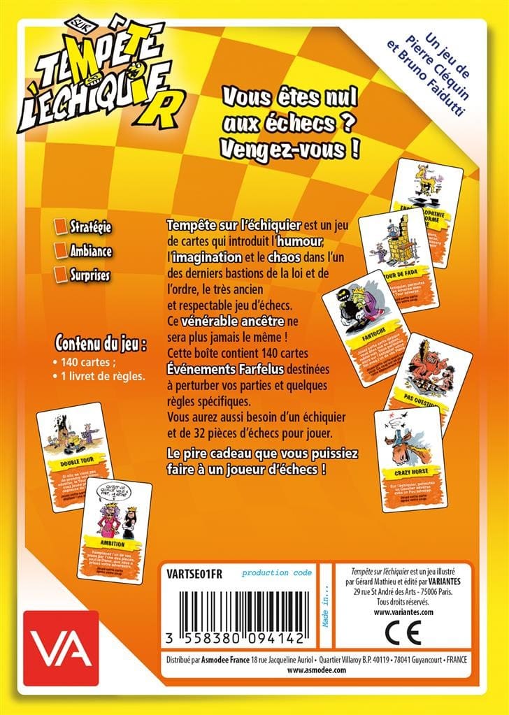 Une partie de Tempête sur l’Échiquier commence comme une partie d’échecs. Chacun dispose de seize pièces, prêtes à évoluer sur un échiquier pour mettre le roi adverse en position de mat. Mais vous disposez aussi de cartes toutes plus loufoques les unes que les autres, que vous pourrez utiliser pour altérer les règles du jeu : marche des pièces, prises, roque, promotion, tout y passe ! Les échecs se transforment, et fort heureusement, ne perdent pas en réflexion ce qu’ils gagnent en bonne humeur.