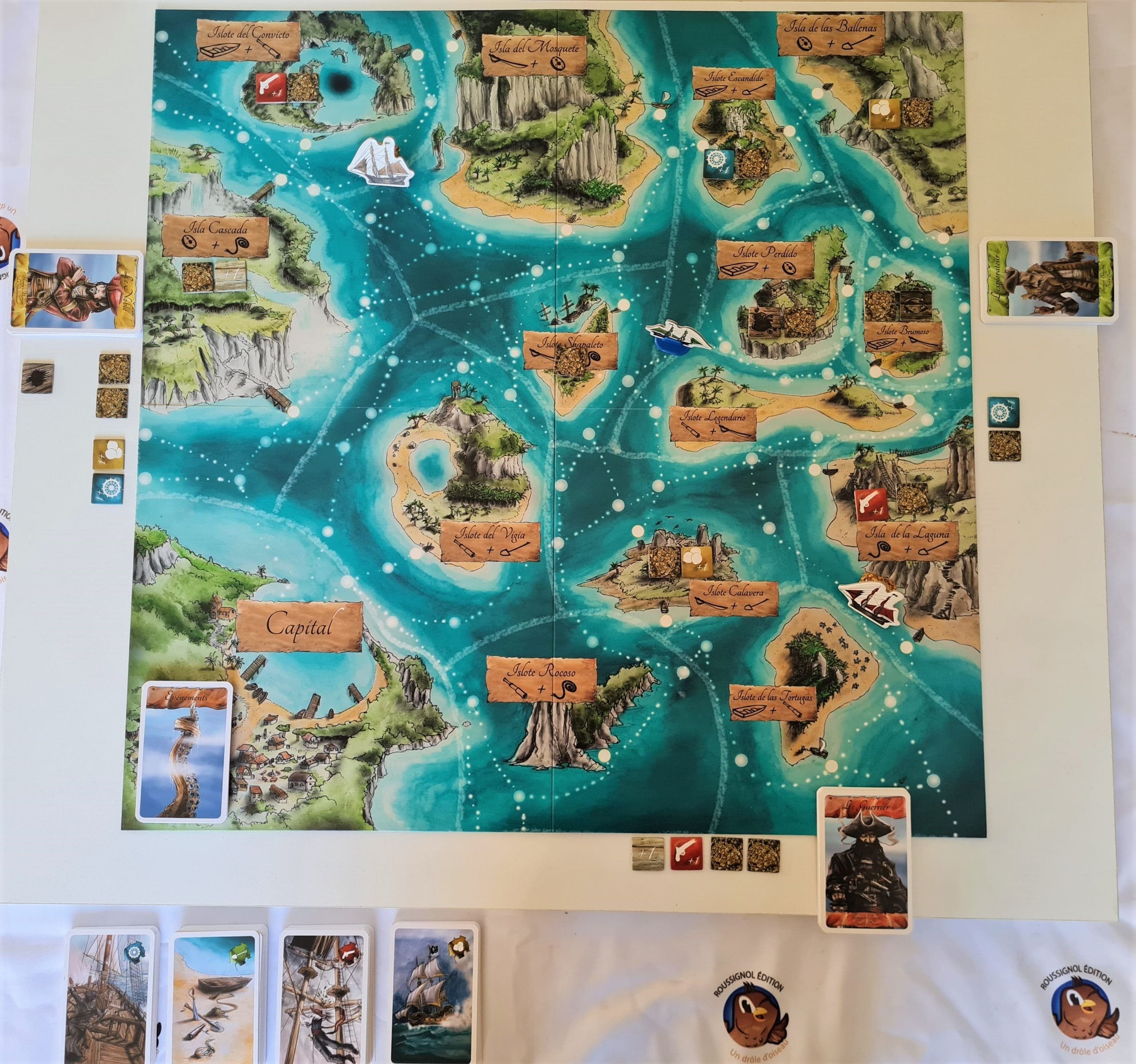 Choisissez votre capitaine, piochez 3 cartes par tour, à vous de faire votre panaché parmi ces 5 pioches : Cartes Pirates. Cartes Objets (obtenez une combinaison spécifique pour trouver un trésor sur une île). Cartes Navigation. Cartes Tir aux Canons. Cartes Abordages ! Jouez les comme bon sous semble, aucun ordre ni limite de cartes à jouer pendant votre tour. Seulement une limite de 12 cartes en main maximum. Quelle sera votre stratégie ? Brutale, rapide, opportuniste ou rusée ? Obtenez et ramenez le plus grand nombre de trésors à la capitale.