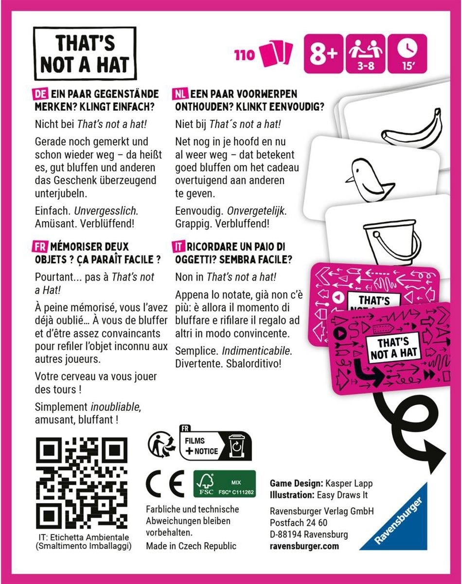 Plongez dans l’univers ludique et hilarant de That’s Not A Hat où la mémoire et le bluff sont les clés de la victoire ! Un jeu idéal pour des moments divertissants en famille ou entre amis.