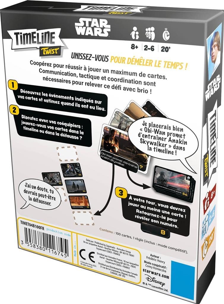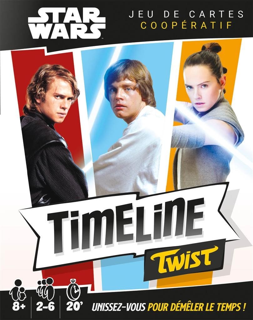Timeline Twist Star Wars est un jeu de cartes coopératif conçu pour 2 à 6 joueurs. Plongez-vous dans l’univers épique de Star Wars et relevez le défi de classer les événements emblématiques dans l’ordre chronologique. Que vous soyez un padawan curieux ou un maître Jedi chevronné, ce jeu offre une expérience stimulante.
