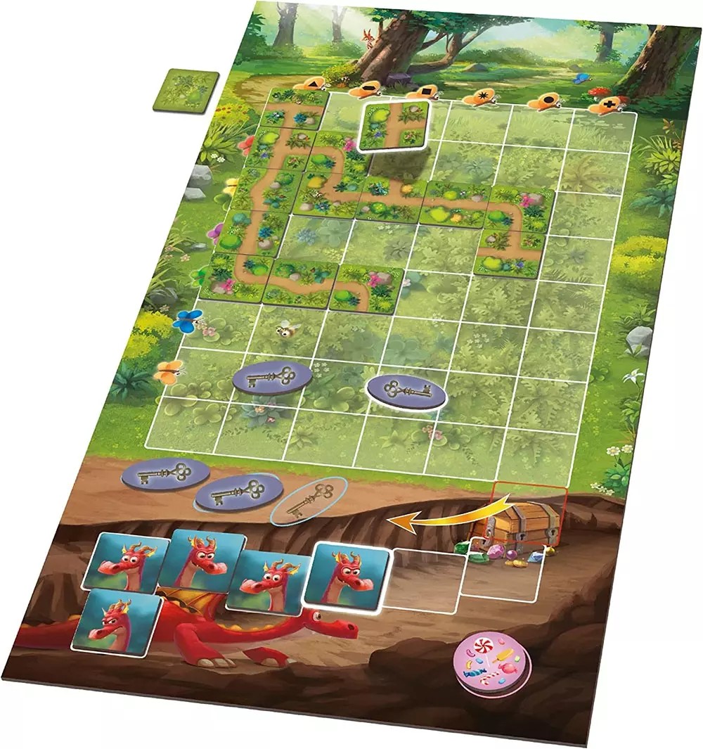 En posant chacun leur tour une tuile sur le plateau, les joueurs doivent faire équipe pour se frayer un chemin au milieu de la forêt et récolter les trois clés qui permettent d’ouvrir le coffre. Mais il ne faut pas trop tarder car le dragon est sur le chemin du retour et il risque fort de surprendre les lutins… et de garder son précieux butin ! Un jeu coopératif et féérique pour tous les lutins en quête d’aventures.