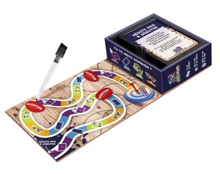 Le jeu inclut également des cartes originales pour pimenter l’expérience et des stickers malins permettant d’utiliser le plateau du TTMC original (versions 1 ou 2) pour des parties intergénérationnelles. C’est un parfait mélange de compétition bon enfant, d’apprentissage et de fun.