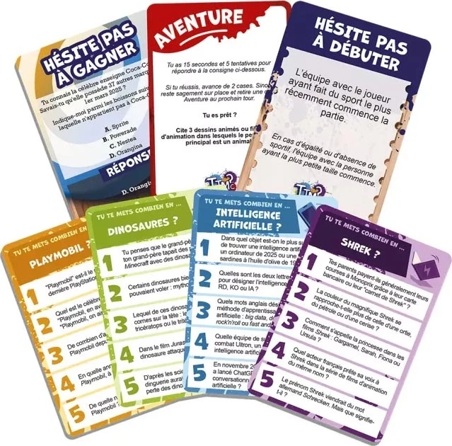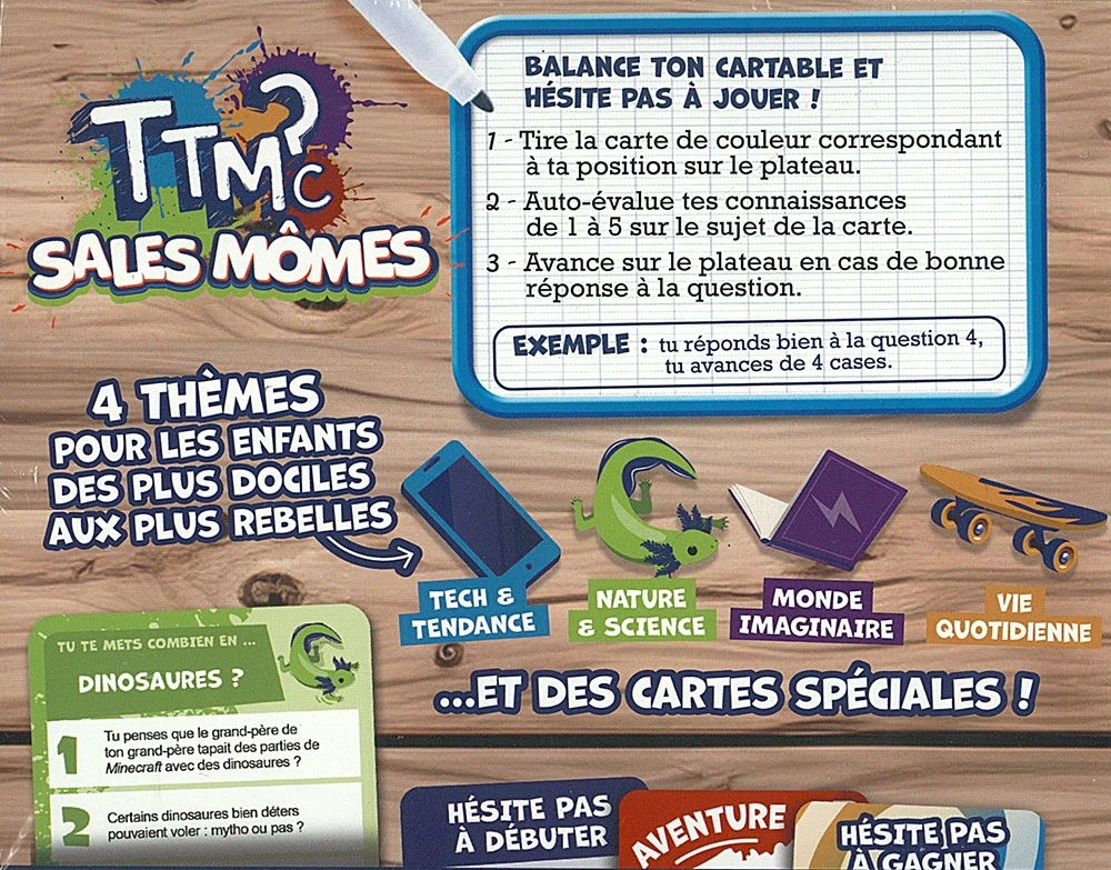 Avec plus de 835 questions réparties sur 162 cartes, TTMC Sales Mômes couvre des thématiques variées qui captivent les jeunes : dinosaures, Playmobil, intelligence artificielle, films d’animation comme Shrek, sport, nature, culture générale… Certaines cartes proposent même des défis express ou des épreuves “Aventure” qui ajoutent rythme et suspense aux parties. Les mécaniques simples et interactives encouragent à jouer en équipe, à discuter et à rire ensemble.