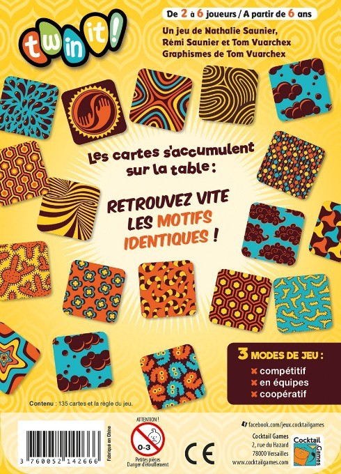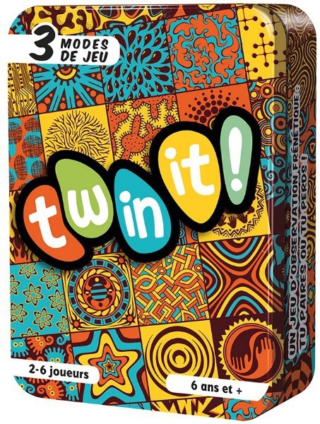 Dans Twin it, les cartes s’accumulent sur la table en formant une mosaïque colorée. Votre but ? Essayer de détecter plus vite que les adversaires les paires de cartes aux motifs exactement identiques ! La plupart des motifs sont en double, certains sont en triple et quelques pièges sont uniques ! Trois modes de jeu complémentaires sont proposés : compétitif, en équipes et coopératif !