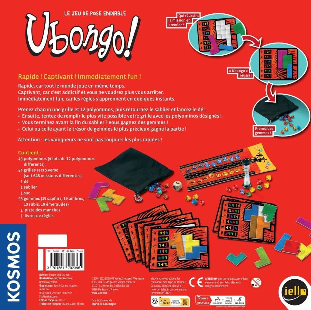 Ubongo est un jeu stimulant qui allie rapidité, réflexion et compétition. Idéal pour les amateurs de casse-tête, ce jeu promet des moments captivants et compétitifs pour toute la famille ou les amis !