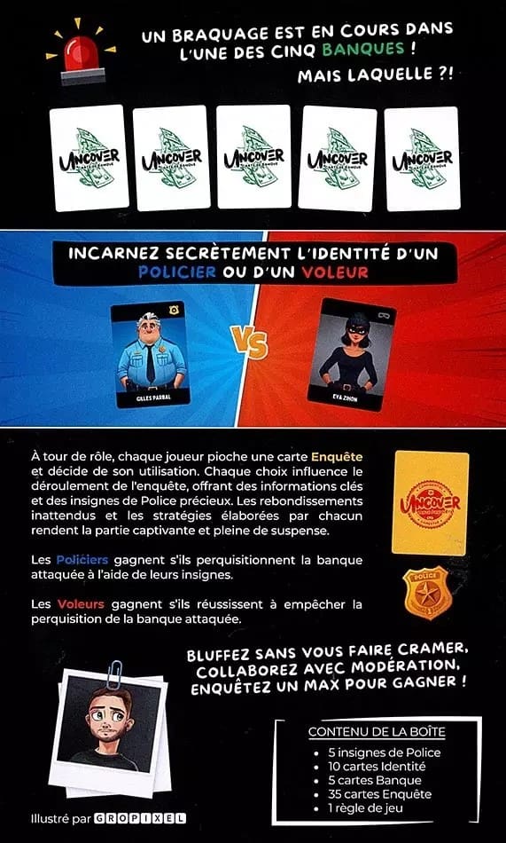 Saurez-vous perquisitionner la bonne banque en tant que Policier, ou emmener l’enquête sur une fausse piste en tant que Voleur ? Uncover : Policiers VS Voleurs vous plonge dans une enquête haletante, où chaque parole, chaque carte jouée, peut faire basculer le cours de la partie !