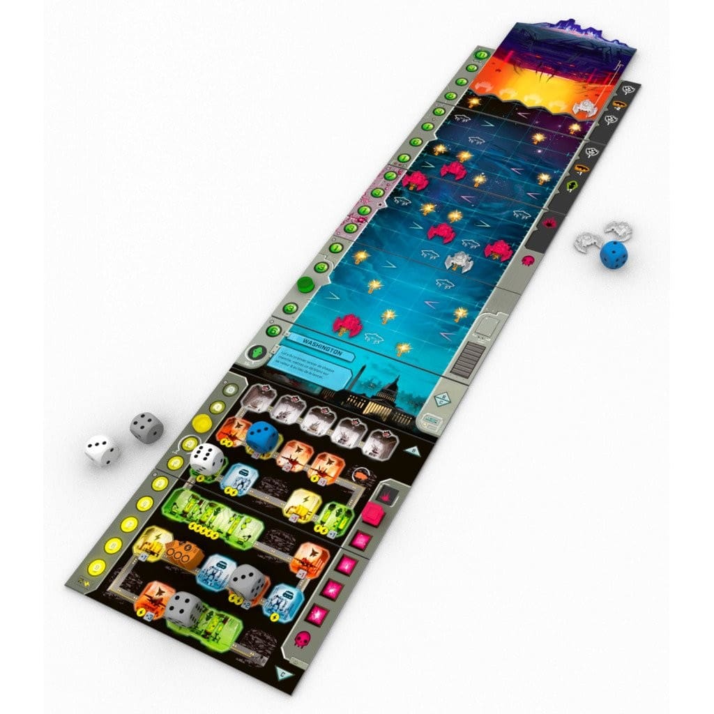 De son côté, le joueur doit optimiser ses lancers de dés en les plaçant à l’intérieur de son bunker souterrain pour développer la riposte. Les dés peuvent être placés sur différentes sections : recherches sur l’envahisseur alien, envoi de chasseurs, déploiement de robots et gain d’énergie. La valeur de chaque dé placé impacte directement vos capacités de production et de défense, et plus vous consacrez de ressources à l’amélioration de votre Bunker, plus votre défense sera efficace. Mais attention : plus vos dés sont forts, plus les chasseurs ennemis vont descendre rapidement !