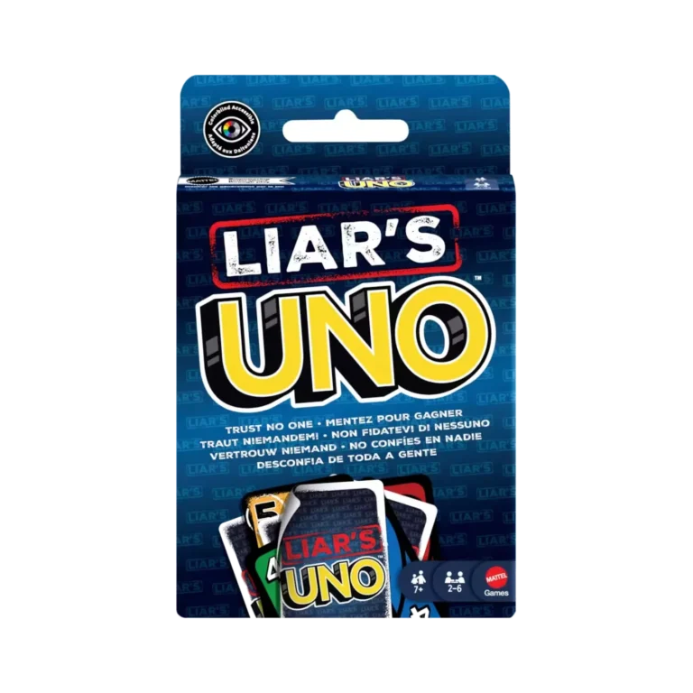 Le jeu où tous les mensonges sont permis ! Uno Liar’s, le UNO pour les tricheurs, les menteurs ou les bluffeurs. Les cartes « Menteur » doivent être jouées face cachée, c’est l’occasion de bluffer (ou pas) !
