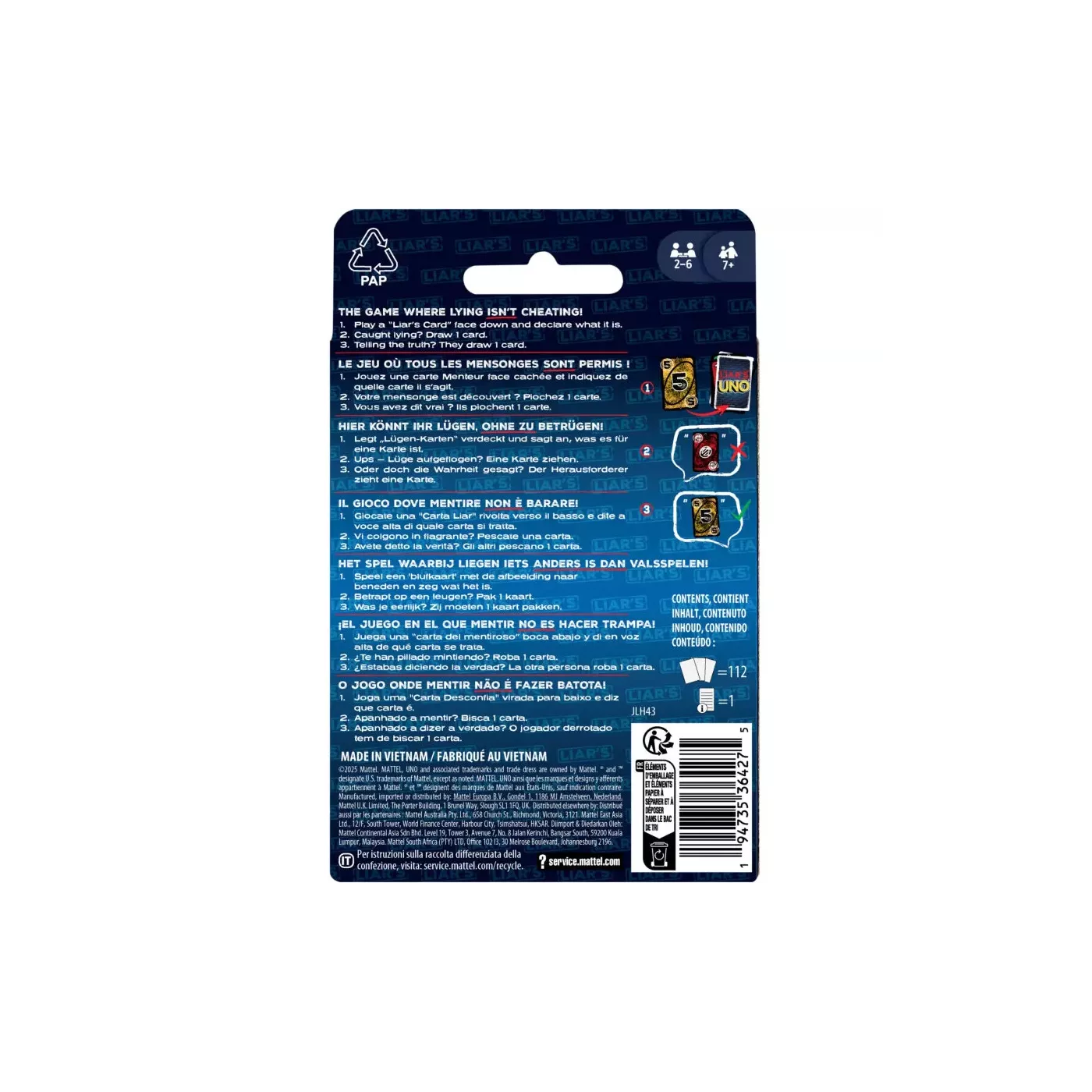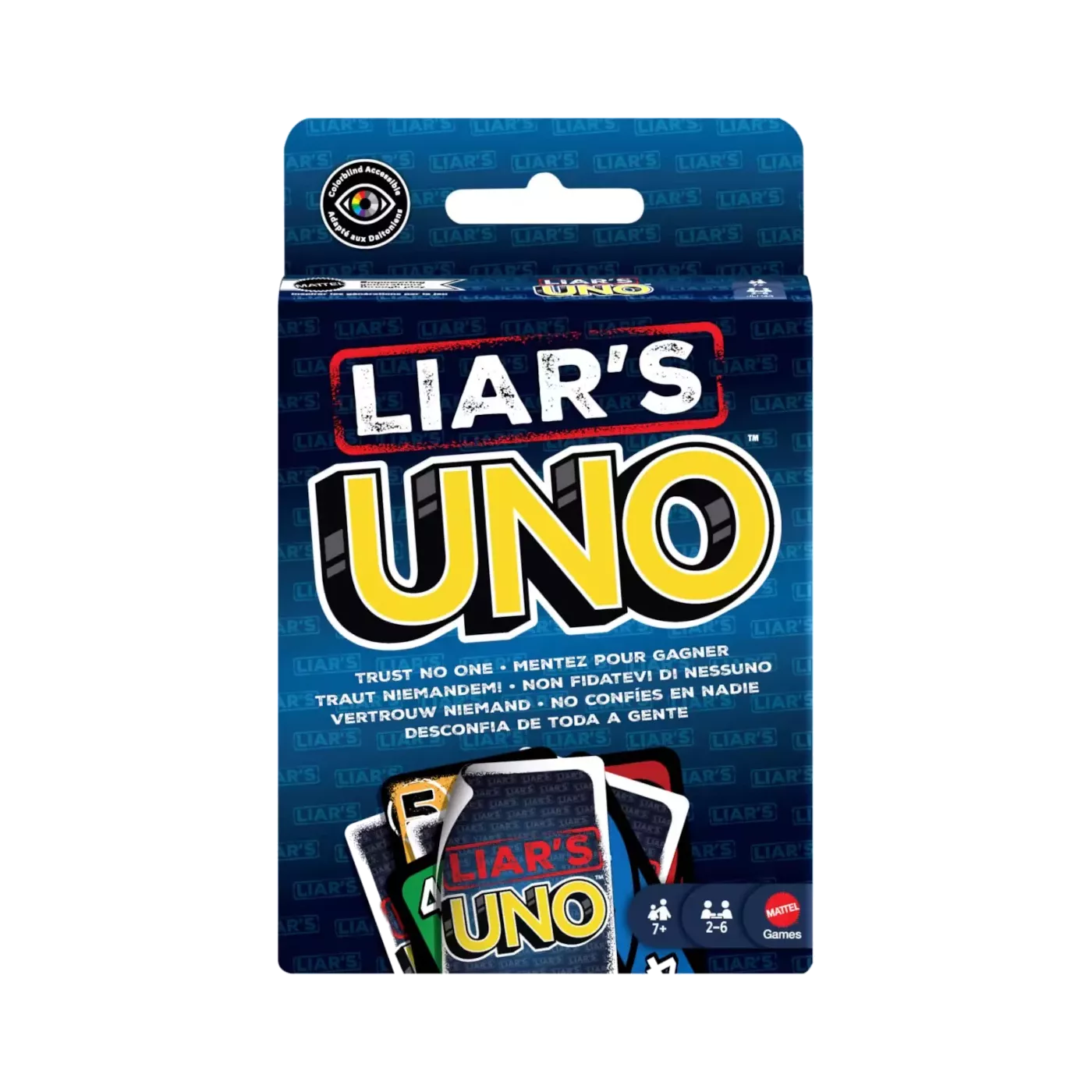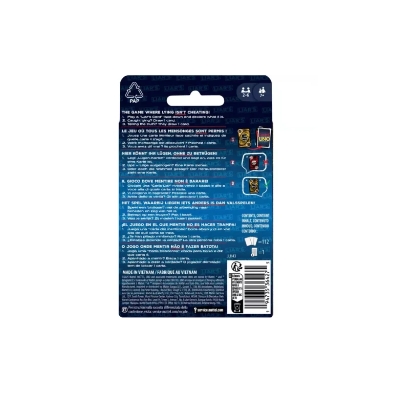 Avec UNO Liar’s, mentir fait partie du jeu ! ; Une « Carte Menteur » est posée face cachée, puis le joueur annonce sa valeur. ; S’il est pris à mentir, il doit tirer une carte. Mais s’il dit la vérité, celui qui l’a accusé doit piocher une carte ! ; S’il est pris à mentir, il doit tirer une carte. Mais s’il dit la vérité, celui qui l’a accusé doit piocher une carte ! ; Tous les joueurs peuvent bluffer pour remporter le jeu, mais lorsqu’il ne leur reste qu’une seule carte, ils doivent quand même crier « UNO » ! ; Des symboles ajoutés à chaque carte permettent d’en identifier la ou les couleurs afin que les joueurs atteints d’une quelconque forme de daltonisme puissent aussi être de la partie ! ; UNO Liar’s est un jeu conçu pour les joueurs à partir de 7 ans et c’est un cadeau amusant pour les fans de jeux de cartes les plus sournois !