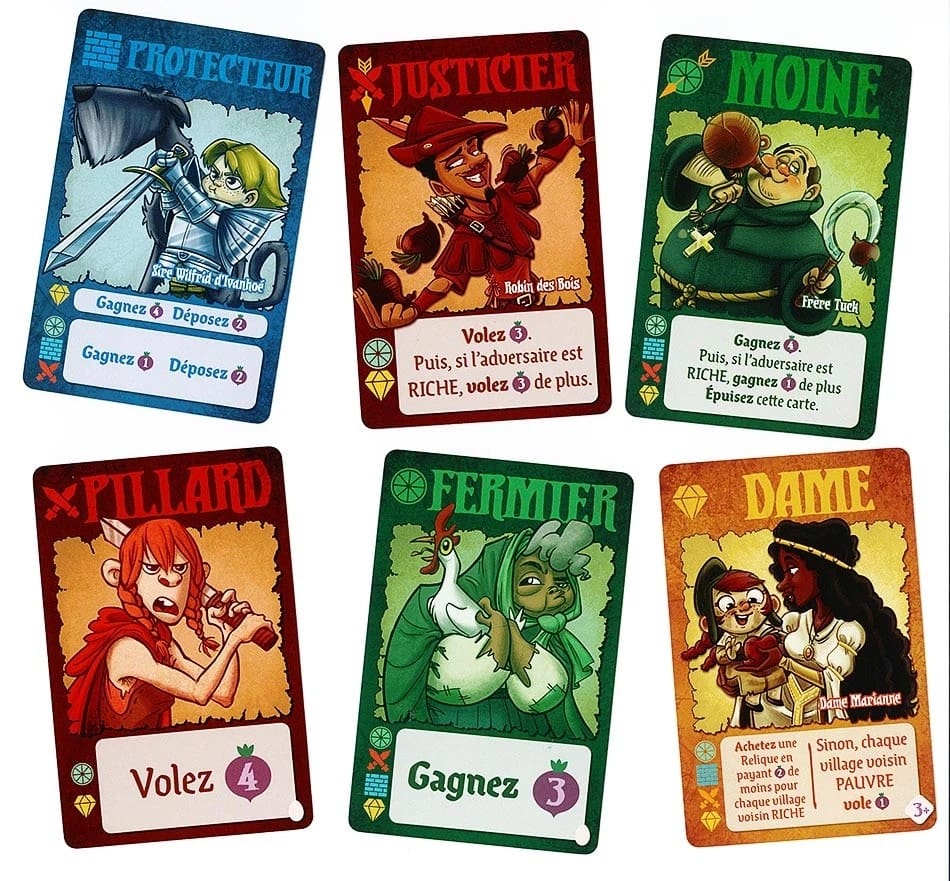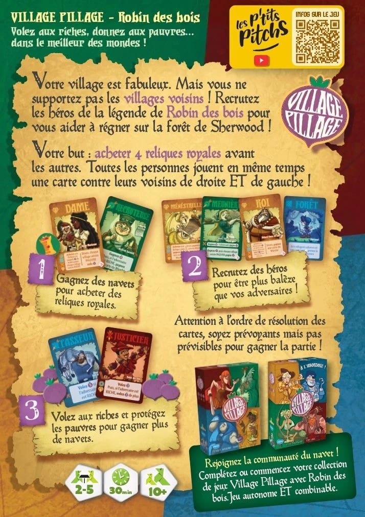 ? Devenez le plus rusé des justiciers Rejoignez l’univers loufoque de Village Pillage dans cette boîte complète aux couleurs de la légende de Robin des Bois. Volez aux riches, aidez les pauvres (ou pas), et n’oubliez pas d’empocher votre part. Votre objectif : accumuler assez de navets (monnaie du jeu) pour acheter trois Reliques royales et prendre le trône !