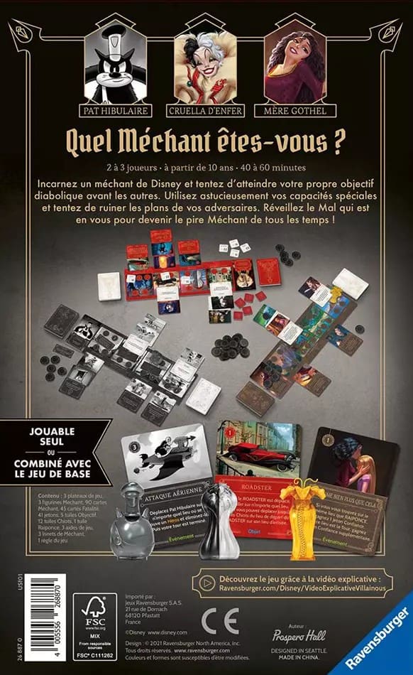 3 Nouveaux Méchants, 3 Stratégies Uniques Cruella d’Enfer (Les 101 Dalmatiens) : Collectez 99 chiots pour confectionner le manteau en fourrure ultime. Utilisez vos sbires pour capturer les chiots disséminés sur le plateau tout en contrecarrant les tentatives des héros de les libérer. Capitaine Pete (Steamboat Willie) : Changez d’objectif selon votre position sur le plateau. Chaque lieu offre une mission différente, vous obligeant à adapter constamment votre stratégie. Et pour une touche rétro, son deck est intégralement en noir et blanc ! Mère Gothel (Raiponce) : Gagnez la confiance de Raiponce en accomplissant des tâches spécifiques. Faites preuve de subtilité et de manipulation pour maximiser la jauge de Confiance tout en éloignant Raiponce des héros qui pourraient perturber vos plans. Un Jeu Stratégiquement Machiavélique Dans Villainous : Cruellement Infect, chaque méchant a un deck personnalisé, des pouvoirs uniques et un objectif à accomplir. Utilisez vos compétences pour avancer vers la victoire tout en perturbant les plans de vos adversaires. Jouez des cartes Fatalité pour introduire des héros Disney comme Pongo, Mickey ou Flynn Rider et ralentir vos rivaux.
