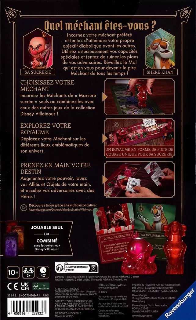 Plongez dans le monde des méchants Disney avec Morsure Sucrée, une extension autonome du célèbre jeu Disney Villainous. Incarnez Sa Sucrerie (Les Mondes de Ralph) ou Shere Khan (Le Livre de la Jungle) et mettez en œuvre vos sombres desseins. Chaque personnage dispose d’un objectif unique, d’un deck personnalisé, et d’une mécanique de jeu distincte.