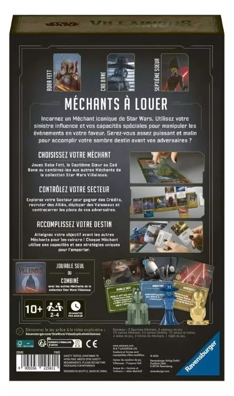 Crédits pour financer vos ambitions. Vaisseaux et alliés pour étendre votre influence dans la galaxie. Des objectifs personnalisés qui reflètent les motivations uniques de chaque méchant. Un Jeu Modulable et Combinable Villainous Star Wars : Vermine & Trahison peut être joué seul pour une expérience à 2-3 joueurs ou combiné avec Villainous Star Wars – La Puissance du Côté Obscur pour étendre votre bande de méchants à 6 joueurs.