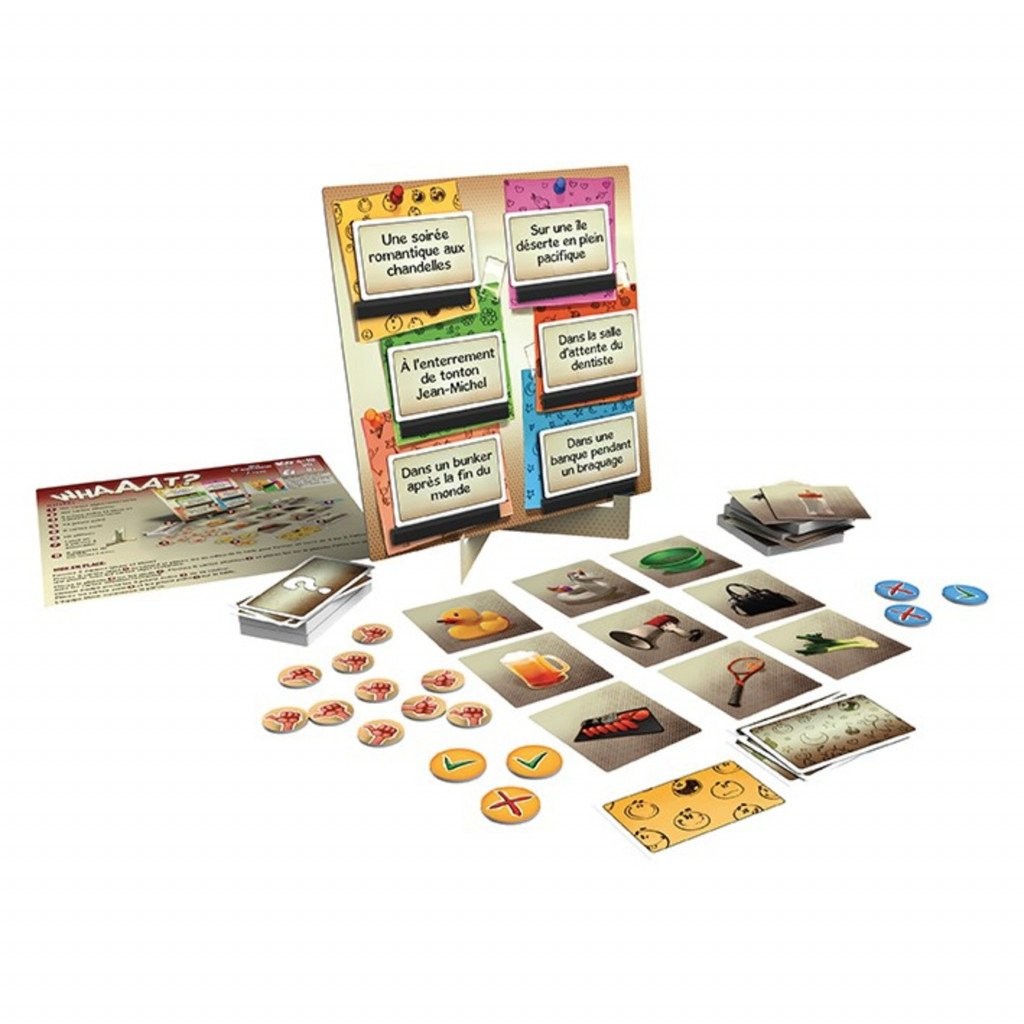 Un canard en plastique pour tuer des zombies ? WHAAAT ? Coincé dans un ascenseur ? Échoué sur une île déserte ? Malheureusement, vous n’avez à votre disposition un canard en plastique, un poireau et tout un tas d’objets superflus pour vous en sortir… Et surtout vous faire comprendre ! Vous devez faire deviner à votre équipe dans quelle situation vous vous trouvez. Pour cela, vous avez des jetons pour signaler lesquelles de ces babioles vous semblent utiles, lesquelles sont hors de propos. À partir de là, à eux de trouver parmi six situations celle que vous affrontez. La première équipe à marquer 10 points gagne la partie ! Rejouabilité importante Du délire, de la communication et beaucoup de déduction, WHAAAT? Vous propose des moments de pure folie, entre amis ou en famille ! Une variante pour 2 joueurs est incluse.