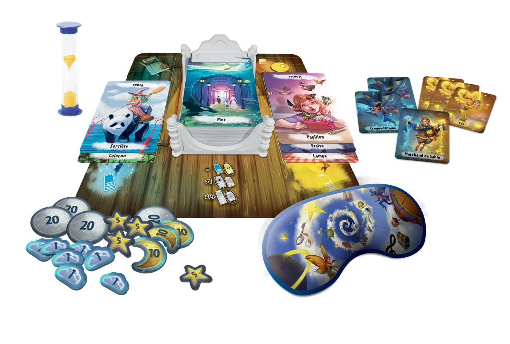 Contenu 11 cartes Esprit du Rêve, 110 cartes Rêve recto-verso, 104 jetons Point, 1 Lit, 1 Tête de lit, 1 plateau, 1 masque, 1 sablier, 1 livret de règles.