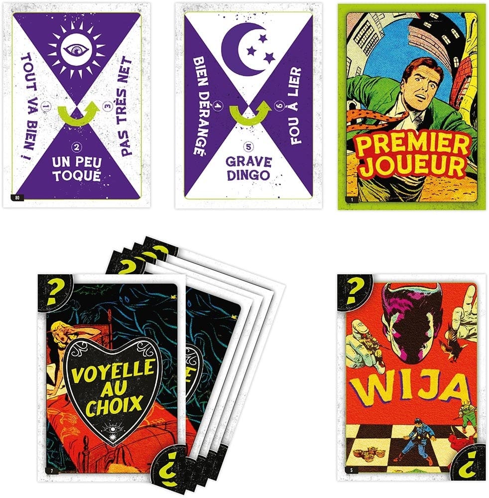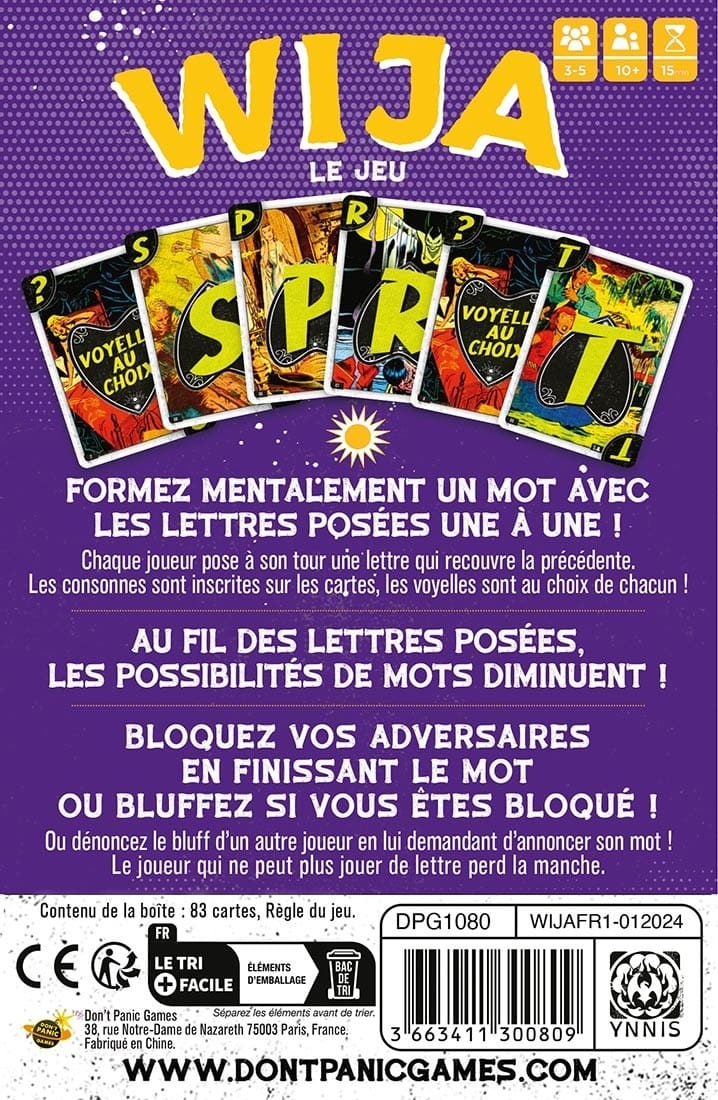 Formez un mot mentalement avec les lettres posées une à une par tous les joueurs. Le premier joueur pose une de ses cartes lettre afin de débuter un mot, sans le divulguer. Le joueur à sa gauche pose alors une de ses cartes par-dessus afin de continuer le mot commencé dans sa tête avec la première lettre posée, toujours sans le dire. Le jeu continue ainsi dans le sens des aiguilles d’une montre jusqu’à ce qu’un joueur ne puisse plus continuer son mot. Lorsqu’un joueur pose une carte Voyelle ou une carte Joker, il ne doit pas révéler la lettre à laquelle il pense ! Lorsqu’un joueur ne peut plus poser de carte afin de continuer son mot, la manche s’arrête. Le joueur qui a le moins échoué à la fin de la partie l’emporte.