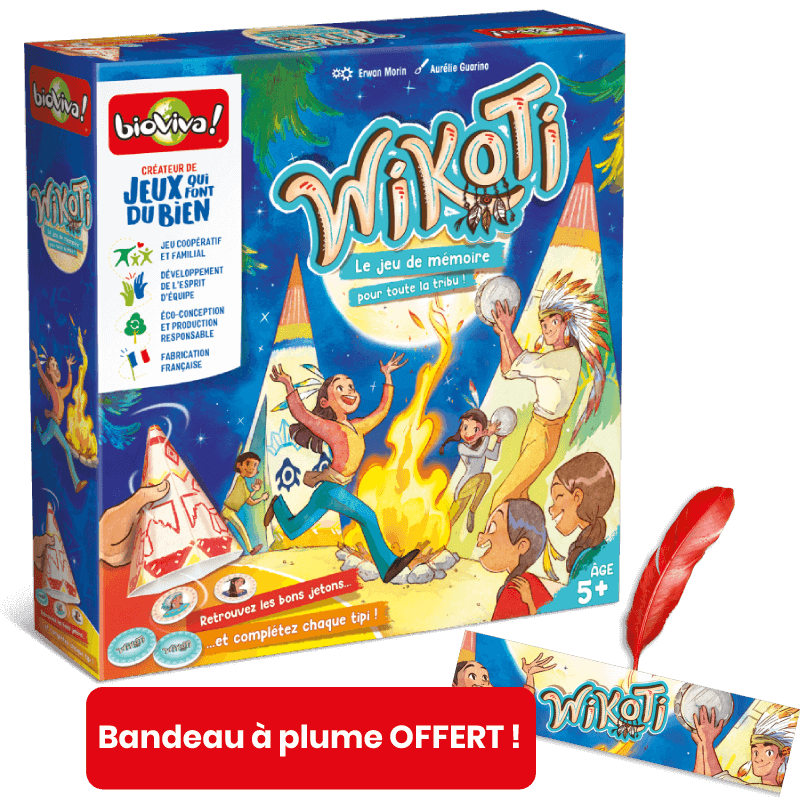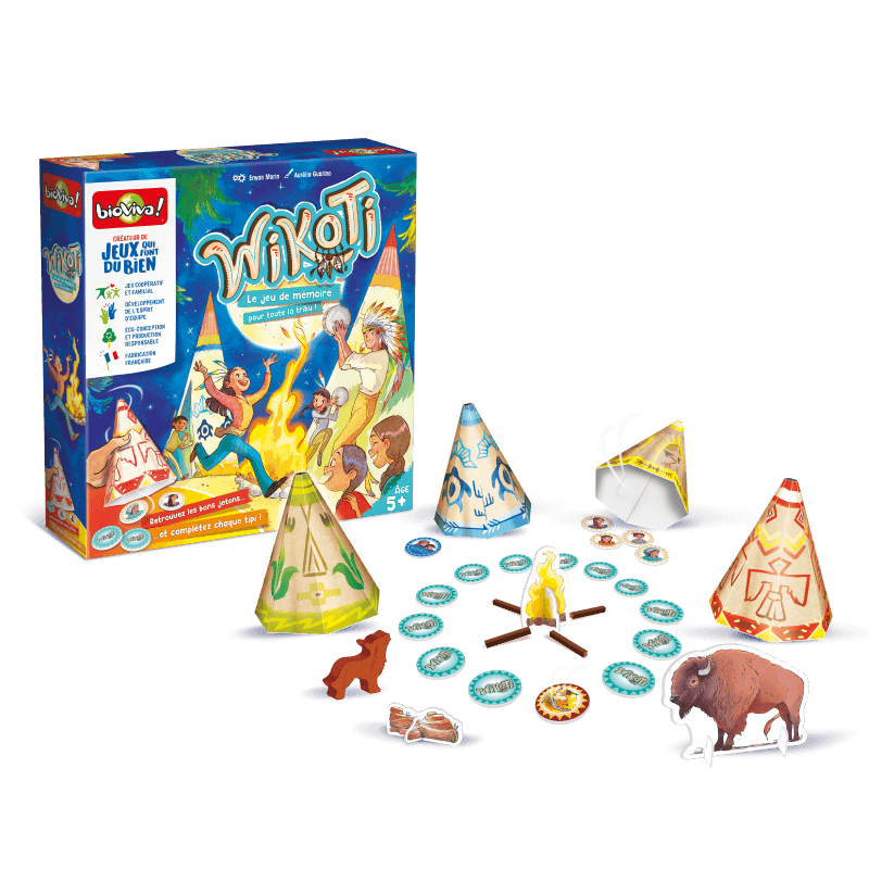 Dans le jeu de mémoire « Wikoti », les enfants dès 5 ans aident les Sioux à rejoindre leur tipi avant la fin de la veillée. Coopération, mémoire et astuce seront leurs meilleures alliées pour l’emporter ! Wikoti grandit avec les enfants avec des niveaux de règles pour tous les âges. Le jeu Wikoti contient un poster et des informations pour découvrir comment vivaient les Sioux.