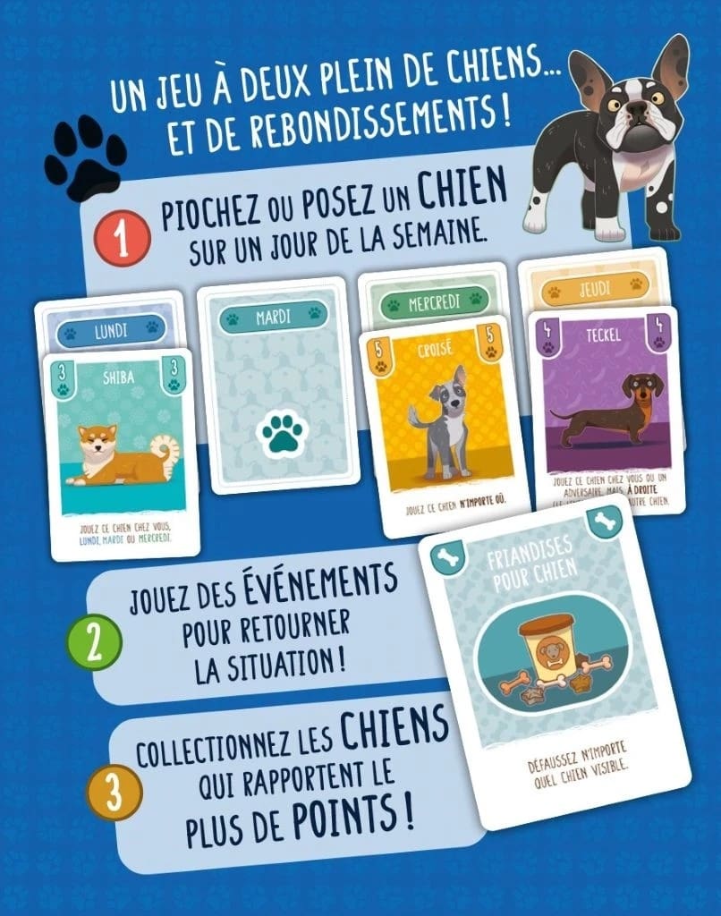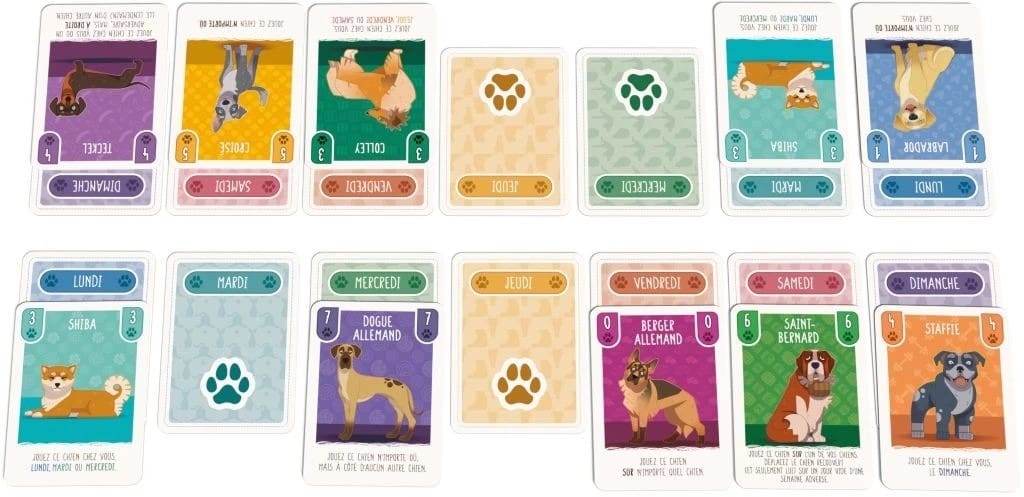 Dans Woof Days, chaque joueur possède sept cartes représentant les jours de la semaine. Votre objectif : remplir chaque jour avec les chiens les plus adaptés, tout en anticipant les actions de votre adversaire.