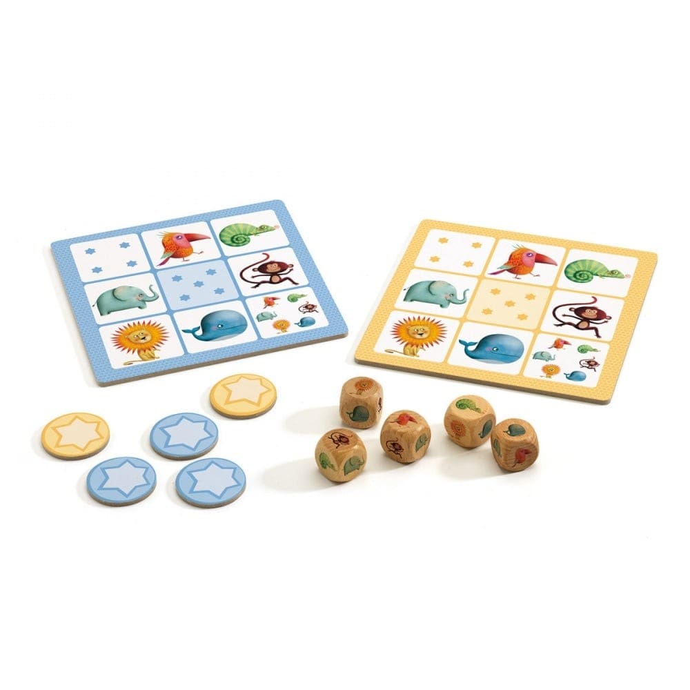 Le jeu Yams Junior de Djeco comprend tout ce dont vous avez besoin pour jouer : 5 dés, 24 jetons, 4 cartes de jeu, et une règle du jeu pour vous guider. Les cartes mesurent environ 14 x 14 cm, les jetons ont un diamètre de 3,5 cm, et les dés en bois sont de taille 2 x 2 x 2 cm.