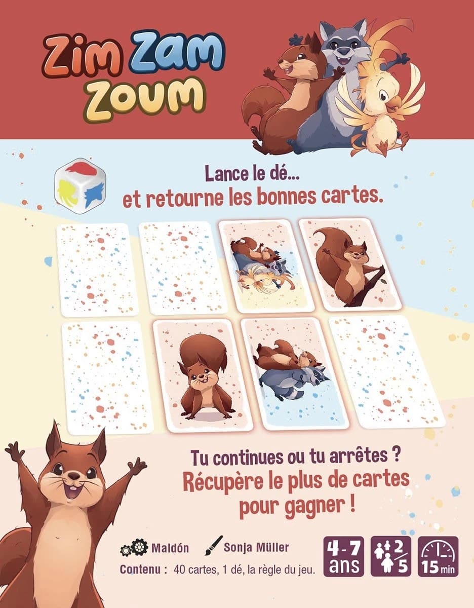 Dans Zim Zam Zoum, les enfants lancent un dé coloré pour savoir quel animal ils doivent retrouver : écureuil, raton laveur, oiseau… Les cartes sont posées face cachée, et chaque découverte correcte permet de continuer l’exploration ou de s’arrêter pour mettre ses trouvailles à l’abri.